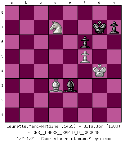 Last move : 1/2-1/2 2010 December 15 19:47:1 [Event "FICGS__CHESS__RAPID_D__000048"] [Site "FICGS"] [Date "2010.11.24"] [Round "1"] [White "Leurette,Marc-Antoine"] [Black "Olla,Jon"] [Result "1/2-1/2"] [WhiteElo "1465"] [BlackElo "1500"] 1.e4 c5 2.Nf3 a6 3.d4 cxd4 4.c3 d6 5.cxd4 Nf6 6.Nc3 g6 7.Bf4 Bg7 8.e5 dxe5 9.Bxe5 Nc6 10.Bd3 Nxe5 11.dxe5 Ng4 12.O-O Nxe5 13.Nxe5 Bxe5 14.Qf3 O-O 15.Rad1 Qc7 16.h3 Bd7 17.Be4 e6 18.Bxb7 Rab8 19.Bxa6 Rxb2 20.Rc1 Qd6 21.Qd3 Qxd3 22.Bxd3 Rfc8 23.Ne4 Rxa2 24.g3 Rxc1 25.Rxc1 Ra1 26.Rxa1 Bxa1 27.f4 Bd4 28.Kf1 e5 29.Nf6+ Kg7 30.Nxd7 exf4 31.gxf4 Be3 32.f5 f6 33.h4 g5 34.Ke2 Bf4 35.hxg5 Bxg5 36.Kf3 Bc1 37.Kg4 Be3 1/2-1/2 Sicilian : O'Kelly variation Kingside Castling by player White (move 12) Kingside Castling by player Black (move 14) 10 pieces endgame at move 31 : White KBNPP , Black KBPPP WHITE : King + 1 Bishop 1 Knight 2 Pawns BLACK : King + 1 Bishop 3 Pawns 9 pieces endgame at move 35 : White KBNPP , Black KBPP WHITE : King + 1 Bishop 1 Knight 2 Pawns BLACK : King + 1 Bishop 2 Pawns 8 pieces endgame at move 35 : White KBNP , Black KBPP WHITE : King + 1 Bishop 1 Knight 1 Pawn BLACK : King + 1 Bishop 2 Pawns This chess game ended in a draw. Follow this game move after move (download)The older I grow, the more I value Pawns. (Keres) Ich würde die 30 stärksten Spieler der USA im Simultanspiel besiegen. (José Raúl Capablanca) Estaba muy claro de que el punto vulnerable del Gran Maestro Americano (Bobby Fischer) radicaba en las posiciones de doble filo, colgantes, irracionales, donde el siempre falló en encontrar un triunfo aún en una posición de clara victoria. (Efim Geller) A ce moment-là, je menaçais de comprendre la position ! (Clément L'Heureux) I live to kill Traxler counterattack. (Ilmars Cirulis)