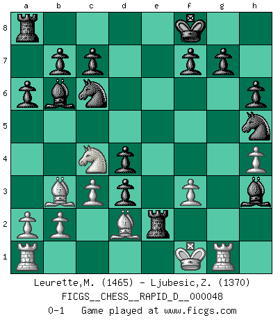 Last move : 0-1 2011 January 6 8:42:44 [Event "FICGS__CHESS__RAPID_D__000048"] [Site "FICGS"] [Date "2010.11.24"] [Round "1"] [White "Leurette,Marc-Antoine"] [Black "Ljubesic,Zeljko"] [Result "0-1"] [WhiteElo "1465"] [BlackElo "1370"] 1.e4 e5 2.Nf3 Nc6 3.Bc4 Bc5 4.Ng5 Qxg5 5.Nc3 Qxg2 6.Rf1 Nf6 7.Nb5 Qxe4+ 8.Qe2 Qxe2+ 9.Kxe2 Bb6 10.d3 d5 11.Bb3 h6 12.Be3 d4 13.Bd2 a6 14.Na3 O-O 15.c3 Re8 16.Rg1 Kf8 17.Rg3 e4 18.Nc4 Bg4+ 19.Ke1 exd3 20.Kf1 Re2 21.f3 Bf5 22.h4 Nh5 23.Rg1 Bh3+ 0-1 Giuoco Piano Kingside Castling by player Black (move 14) Player Black won this chess game. Follow this game move after move (download)White lost because he failed to remember the right continuation and had to think up the moves himself. (Siegbert Tarrasch) Spiel ein langweiliges Spiel zu Ende und lustige Dinge können passieren. (Hans Ree) El Ajedrez, como cualquier actividad creativa, solo puede existir a través del esfuerzo combinado de aquellos que tienen talento creativo y de aquellos que poseen la habilidad de organizar su trabajo creativo. (Mikhail Botvinnik) Que feriez-vous si vous étiez en train de jouer aux échecs et que la fin du monde arrive ? Je continuerais à jouer. (Saint Borromée) The best teachers teach from the heart, not from the book. (Author unknown)