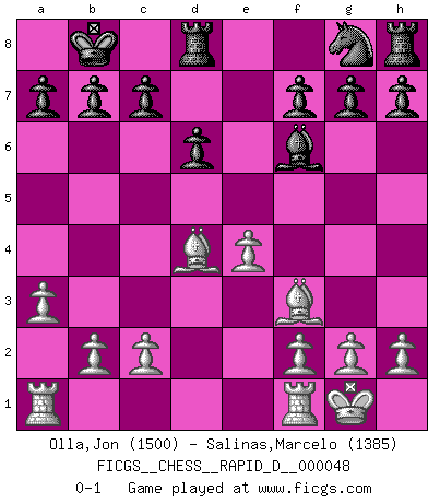Last move : 0-1 2011 February 10 10:18:12 [Event "FICGS__CHESS__RAPID_D__000048"] [Site "FICGS"] [Date "2010.11.24"] [Round "1"] [White "Olla,Jon"] [Black "Salinas,Marcelo"] [Result "0-1"] [WhiteElo "1500"] [BlackElo "1385"] 1.e4 e5 2.Nf3 d6 3.d4 Bg4 4.Be2 Bxf3 5.Bxf3 exd4 6.Qxd4 Nc6 7.Qa4 Qf6 8.Nc3 Qd4 9.Qb5 Qb4 10.a3 Qxb5 11.Nxb5 O-O-O 12.Be3 Kb8 13.O-O Be7 14.Nd4 Nxd4 15.Bxd4 Bf6 0-1 This chess game has been lost on time (started : 2010.11.24 18:23:44) Philidor's defense Queenside Castling by player Black (move 11) Kingside Castling by player White (move 13) Player Black won this chess game. Follow this game move after move (download)That's what Chess is all about. One day you give your opponent a lesson, the next day he gives you one. (Bobby Fischer) Taktik ist was man tun muß, wenn etwas zu tun ist. Strategie ist was man tun muß, wenn nichts zu tun ist. (Savielly Grigorievitsch Tartakower) Tu cuerpo tiene que estar en óptima condición. Tu Ajedrez se deteriora como lo hace tu cuerpo. No puedes separar la mente y el cuerpo. (Bobby Fischer) RxDa4 pat (...) The problem with manipulation is that people can turn on you. (Horatio Caine, C.S.I. Miami)
