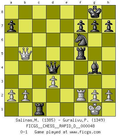 Last move : 0-1 2011 January 26 11:27:32 [Event "FICGS__CHESS__RAPID_D__000048"] [Site "FICGS"] [Date "2010.11.24"] [Round "1"] [White "Salinas,Marcelo"] [Black "Guralivu,Paul-Iosif"] [Result "0-1"] [WhiteElo "1385"] [BlackElo "1349"] 1.e4 c5 2.Bc4 e6 3.Qf3 Nc6 4.Ne2 Nf6 5.Na3 d5 6.exd5 exd5 7.Bb5 Bd6 8.Bxc6+ bxc6 9.c4 O-O 10.cxd5 cxd5 11.O-O Bg4 12.Qd3 c4 13.Nxc4 dxc4 14.Qxc4 Rc8 15.Qa6 Re8 16.Nc3 Bc5 17.d3 Bxf2+ 18.Rxf2 Re1+ 19.Rf1 Qd4+ 20.Be3 Rxe3 21.Ne4 Rxe4 22.Rf2 Re2 23.Raf1 Rxf2 24.Qb5 Rf5 25.Rf2 Rc1+ 0-1 This chess game has been lost on time (started : 2010.11.24 18:23:44) Sicilian defense Kingside Castling by player Black (move 9) Kingside Castling by player White (move 11) Player Black won this chess game. Follow this game move after move (download)War is the child of passion, passion is the child of narcissism and narcissism is the child. (...) Another game ? (Thibault de Vassal) Meine Liebe ist Schach, Schach, Schach. Ich muss jeden Tag Schach spielen, deshalb fühle ich mich so stark. (Miguel Najdorf) Sin errores no puede haber brillantez. (Emanuel Lasker) La guerre est enfant de la passion, la passion est enfant du narcissisme et le narcissisme est l'enfant. (...) Une autre partie ? (Thibault de Vassal) True nature is revealed in times of difficulty. (Chinese proverb)