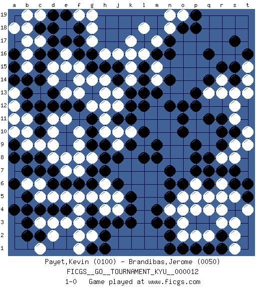 Last move : 1-0 2007 February 26 12:35:58 [Event "FICGS__GO__TOURNAMENT_KYU__000012"] [Site "FICGS"] [Date "2006.11.29"] [Round "1"] [Black "Payet,Kevin"] [White "Brandibas,Jerome"] [Result "1-0"] [Rating 1 "0100"] [Rating 2 "0050"] 1.q16 q5 2.d17 d5 3.c15 d14 4.d12 e15 5.f16 e16 6.e17 f15 7.g16 h16 8.g15 g14 9.h15 j16 10.j15 k15 11.k16 k17 12.l15 k14 13.l17 l16 14.m16 k16 15.l14 m17 16.n17 l18 17.k13 m15 18.n16 m14 19.l13 g17 20.f17 g18 21.f18 f19 22.e19 g19 23.q7 q9 24.r5 r4 25.q6 p4 26.p5 q4 27.n5 r6 28.r7 s5 29.s7 o5 30.o6 p6 31.p7 p5 32.n7 o8 33.p8 o7 34.n6 o9 35.p9 p10 36.o10 n10 37.o11 n8 38.m8 n9 39.l8 n11 40.n12 p11 41.o12 m12 42.m13 l11 43.r11 r10 44.p12 r8 45.q11 q10 46.s10 s9 47.q8 s11 48.r9 t10 49.r10 j13 50.n14 s12 51.s14 n18 52.o18 o19 53.p18 r13 54.q14 r14 55.r15 s13 56.s15 t14 57.l12 m11 58.k11 k10 59.l10 l9 60.m9 m10 61.k9 j10 62.l10 j12 63.d7 d10 64.e6 e8 65.g6 f7 66.f6 e7 67.d6 d8 68.n3 n4 69.m4 o4 70.n2 t9 71.h8 g8 72.h9 h10 73.g9 f9 74.g10 f10 75.g11 h11 76.c14 q13 77.p13 t15 78.t16 t13 79.s17 s8 80.h12 g12 81.d13 e13 82.e12 f13 83.f12 h13 84.e14 d15 85.j14 h14 86.d16 f14 87.p19 n19 88.g7 f8 89.c8 c9 90.c11 b10 91.c10 d9 92.b8 b9 93.b7 e11 94.b12 b11 95.a9 a10 96.a8 a12 97.b13 d11 98.c12 a13 99.a14 a11 100.q1 p2 101.p1 o2 102.o1 q2 103.r2 r3 104.m3 s2 105.r1 s1 106.n1 o3 107.s6 r5 108.d4 c5 109.c4 e5 110.e4 f5 111.g4 b4 112.b3 j9 113.j8 g5 114.h5 f4 115.g3 f3 116.b5 b6 117.a4 c6 118.c7 g2 119.h3 b16 120.c16 b17 121.a15 b15 122.b14 a18 123.c18 b18 124.a16 c19 125.d19 b19 126.a6 e3 127.h2 h6 128.j6 j4 129.j3 j5 130.h7 h4 131.k4 h6 132.k5 h5 133.k3 d3 134.c2 c3 135.b4 d2 136.b2 c1 137.g1 f2 138.t5 t4 139.t6 s3 140.j11 h12 141.k12 f1 142.h1 c17 143.d18 1-0 Here are the names of the openings (joseki) played in the four corners : Corner q4 : q5 q7 Takamoku (Gomok, Gaomu`) 5-4 Point. The takamoku (high) point (5-4). With its emphasis on influence, the 5-4 point complements the 4-4 (hoshi) point in creating an influence-oriented fuseki. Corner d4 : d5 d7 Takamoku (Gomok, Gaomu`) 5-4 Point. The takamoku (high) point (5-4). With its emphasis on influence, the 5-4 point complements the 4-4 (hoshi) point in creating an influence-oriented fuseki. Player Black won this Go (weiqi, baduk) game. Follow this game move after move (download)Ikken tobi is never wrong. (Anonymous) It is a good thing for an uneducated man to read books of quotations. (Winston Churchill)
