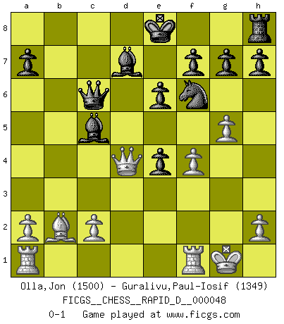 Last move : 0-1 2010 December 8 21:52:26 [Event "FICGS__CHESS__RAPID_D__000048"] [Site "FICGS"] [Date "2010.11.24"] [Round "1"] [White "Olla,Jon"] [Black "Guralivu,Paul-Iosif"] [Result "0-1"] [WhiteElo "1500"] [BlackElo "1349"] 1.e4 c5 2.f4 d6 3.Nf3 Nf6 4.Nc3 Nc6 5.Bc4 e6 6.O-O Be7 7.d4 d5 8.Bb5 dxe4 9.Ne5 cxd4 10.Nxc6 bxc6 11.Bxc6 Bd7 12.Bxa8 dxc3 13.Qd4 cxb2 14.Bxb2 Qxa8 15.g4 Qc6 16.g5 Bc5 0-1 Sicilian : Grand Prix attack Kingside Castling by player White (move 6) Player Black won this chess game. Follow this game move after move (download)Tactics flow from a superior position. (Bobby Fischer) Ich kenne keine einzige Person, die behaupten würde, Garri Kasparow sei ein guter Mensch (Nigel Short) Los errores estan ahí, esperando a que se cometan. (Savielly Tartakower) Dans le domaine de la peinture, de la gravure et de la sculpture, dès la première décennie de notre siècle, les artistes abandonnent la représentation de la partie d'échecs pour se concentrer sur les pièces, sur les échiquiers et sur toutes les variations auxquelles les unes et les autres peuvent donner lieu. On passe en quelque sorte d'un thème social à un thème musical (au sens de la musica médiévale, c'est-à-dire d'une notion qui inclue le rythme, l'harmonie, la construction et la déconstruction, etc.). Graphiquement et picturalement, l'échiquier apparaît comme une structure ouverte, dynamique, d'une richesse infinie, autorisant toutes les combinatoires et débouchant sur des mouvements et des rythmes de nature exponentielle. (Michel Pastoureau) The real danger is not that computers will begin to think like men, but that men will begin to think like computers. (Sydney J. Harris)