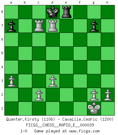 Last move : 1-0 2010 December 22 20:4:6 [Event "FICGS__CHESS__RAPID_E__000039"] [Site "FICGS"] [Date "2010.11.25"] [Round "1"] [White "Quanter,Kirsty"] [Black "Cavaille,Cedric"] [Result "1-0"] [WhiteElo "1106"] [BlackElo "1200"] 1.e4 Nf6 2.e5 Ng8 3.f4 d6 4.Nf3 dxe5 5.Nxe5 Nc6 6.Nxc6 bxc6 7.Qf3 Qd5 8.Be2 Qxf3 9.Bxf3 Bb7 10.O-O e6 11.d3 Nf6 12.Bd2 O-O-O 13.Be3 Kb8 14.Nc3 h5 15.a3 Nd7 16.b4 c5 17.bxc5 Nxc5 18.Rab1 Kc8 19.Bxb7+ Nxb7 20.f5 Bc5 21.Bxc5 Nxc5 22.Rb5 Nb7 23.fxe6 fxe6 24.Rg5 Rh7 25.Rg6 e5 26.Re6 R7h8 27.Rxe5 Rde8 28.Rg5 Reg8 29.Nd5 Nd8 30.Ne7+ Kd7 31.Nxg8 Rxg8 32.Rxh5 Ne6 33.Rf7+ Ke8 34.Rhf5 Nd8 35.Rxc7 Rf8 36.Re5+ Ne6 37.Rxe6+ Kd8 38.R6e7 Re8 39.Red7+ 1-0 Alekhine's defense : Brooklyn defense Kingside Castling by player White (move 10) Queenside Castling by player Black (move 12) Player White won this chess game. Follow this game move after move (download)First-class players lose to second-class players because second-class players sometimes play a first-class game. (Siegbert Tarrasch) Jede Eröffnung ist gut genug um gespielt zu werden, wenn nur ihr Ruf schlecht genug ist. (Savielly Grigorievitsch Tartakower) Del Ajedrez se ha dicho que la vida no es lo suficientemente larga para él, pero eso es culpa de la vida, no del Ajedrez. (William Ewart Napier) Les Echecs ne sont pas pour les âmes timides. Ils requièrent un homme entier, qui ne s'arrête pas aveuglément à ce qui a été déjà établi, mais qui tente individuellement de sonder les profondeurs du jeu. (W. Steinitz) Games, world of games... There's always an opponent, and there's always a victim. (Revolver, movie)