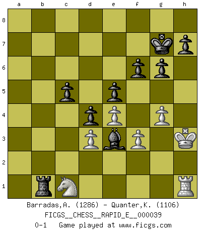 Last move : 0-1 2010 December 13 21:21:40 [Event "FICGS__CHESS__RAPID_E__000039"] [Site "FICGS"] [Date "2010.11.25"] [Round "1"] [White "Barradas,Anderson"] [Black "Quanter,Kirsty"] [Result "0-1"] [WhiteElo "1286"] [BlackElo "1106"] 1.e4 e5 2.Nf3 Nc6 3.Bb5 Nge7 4.O-O a6 5.Ba4 b5 6.Bb3 d5 7.d3 Bg4 8.h3 Bxf3 9.Qxf3 f6 10.Nc3 Nd4 11.Qh5+ g6 12.Qd1 Nxb3 13.axb3 d4 14.Ne2 Nc6 15.Bd2 Qd7 16.c4 Nb4 17.Bxb4 Bxb4 18.Nc1 O-O 19.Na2 Bd6 20.Qd2 a5 21.cxb5 Qxb5 22.Nc1 Rfb8 23.h4 a4 24.bxa4 Qxb2 25.Qxb2 Rxb2 26.a5 Ra6 27.Ra4 Bb4 28.Na2 Bd2 29.Nc1 Rxa5 30.Rxa5 Bxa5 31.f3 Bd2 32.Rd1 Be3+ 33.Kh1 Bf2 34.Kh2 Bxh4 35.Kh3 Bf2 36.g4 c5 37.Rh1 Be3 38.Rf1 Kg7 39.Rh1 Rb1 0-1 Ruy Lopez : Cozio defense Kingside Castling by player White (move 4) Kingside Castling by player Black (move 18) Player Black won this chess game. Follow this game move after move (download)It is peculiar but a fact nevertheless, that gamblers in chess always have enthusiastic followers. (Botvinnik) Ich glaube, ich kenne inzwischen die Gründe für mein Versagen: schachliche Charakterfehler. Ich war nie ein Wunderkind und in meiner gesamten menschlichen Entwicklung immer zu langsam. (Viktor Kortschnoi) El Ajedrez es de 30 a 40 por ciento psicología. Uno no cuenta con esto cuando se juega contra una computadora. No lo puedo confundir. (Judith Polgar) Fischer est le meilleur joueur du monde et Karpov n'est qu'un joueur de bistrot. (Garry Kasparov, agé de 16 ans) Heh, heh, heh. Time to abandon ship. (General Grievous in Star Wars ep.3)