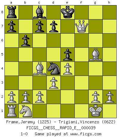 Last move : 1-0 2011 January 27 14:40:13 [Event "FICGS__CHESS__RAPID_E__000039"] [Site "FICGS"] [Date "2010.11.25"] [Round "1"] [White "Frame,Jeremy"] [Black "Trigiani,Vincenzo"] [Result "1-0"] [WhiteElo "1225"] [BlackElo "0622"] 1.e4 e5 2.Nf3 Bc5 3.Bc4 Nf6 4.O-O Ng4 5.d3 Nxf2 6.Rxf2 Bxf2+ 7.Kxf2 Nc6 8.Ng5 b6 9.Nxf7 Qh4+ 10.Kg1 Rf8 11.Bg5 Qh5 12.Qxh5 g6 13.Qxh7 Nd4 14.Qxg6 Rxf7 15.Qxf7+ 1-0 King's knight Opening Kingside Castling by player White (move 4) Player White won this chess game. Follow this game move after move (download)Chess demands total concentration. (Bobby Fischer) Im Schach gewinnt jeder. Hat man Freunde am Spiel - und das ist die Hauptsache - ist auch der Verlust einer Partie kein Unglück. (David Bronstein) El jugador de combinación piensa hacia adelante; comienza de la posición dada y trabaja las movidas contundentes en su mente. (Emanuel Lasker) Toutes les manuvres exécutées sur une colonne ouverte ont pour but ultime l'intrusion définitive sur la septième ou la huitième rangée, en plein cur de la position ennemie. (Aaron Nimzovitch) Fame, I have already. Now I need the money. (an elderly Steinitz)