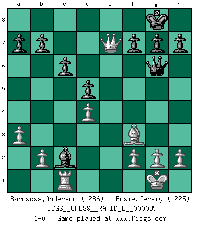 Last move : 1-0 2010 December 13 14:3:0 [Event "FICGS__CHESS__RAPID_E__000039"] [Site "FICGS"] [Date "2010.11.25"] [Round "1"] [White "Barradas,Anderson"] [Black "Frame,Jeremy"] [Result "1-0"] [WhiteElo "1286"] [BlackElo "1225"] 1.e4 e5 2.Nf3 Nf6 3.Nxe5 d6 4.Nf3 Nxe4 5.d3 Nf6 6.Nc3 Be7 7.Be2 O-O 8.O-O c6 9.Re1 Be6 10.Be3 d5 11.d4 Nbd7 12.Bf4 Re8 13.Ne5 Nxe5 14.Bxe5 Bd6 15.Bxf6 Qxf6 16.Bf3 Bf5 17.Rxe8+ Rxe8 18.Qd2 Bb4 19.a3 Bxc3 20.Qxc3 Qg6 21.Rc1 Re7 22.Qb4 Bxc2 23.Qxe7 1-0 Petrov : French attack Kingside Castling by player Black (move 7) Kingside Castling by player White (move 8) Player White won this chess game. Follow this game move after move (download)Good offense and good defense both begin with good development. (Bruce A. Moon) Du weisst es gibt ein Problem mit Computern und Fernschach, wenn jeder eine Rating von 2450 hat. (John Christen Knudsen) El Ajedrez es tan interesante por sí solo, que no es necesario un interés monetario para persuadir a una persona a que lo practique; por lo tanto, nunca se juega por dinero. (Benjamin Franklin) Le pion, dans sa simplicité, marche droit devant lui, mais lorsqu'il prend, il le fait obliquement? Ainsi l'homme, tant qu'il reste pauvre, marche dans la droiture et vit honnêtement, mais lorsqu'il recherche les honneurs, il flatte, se parjure et, par les voies obliques, cherche une position supérieure sur l'échiquier du monde. (Jean de Galles) Perseverance does not equal worthiness. Next time you want to get my attention, wear something fun. Low-riding jeans are hot. (Gregory House, House M.D.)