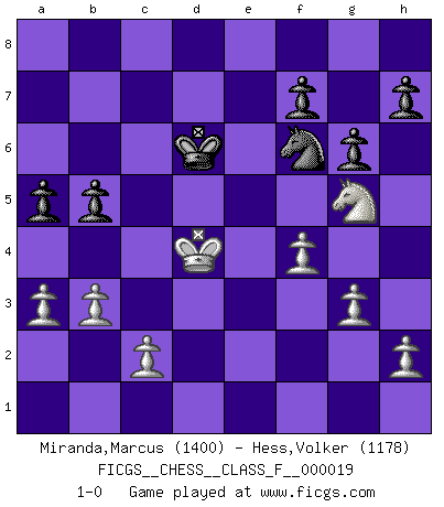 Last move : 1-0 2006 December 25 9:40:13 [Event "FICGS__CHESS__CLASS_F__000019"] [Site "FICGS"] [Date "2006.12.01"] [Round "1"] [White "Miranda,Marcus"] [Black "Hess,Volker"] [Result "1-0"] [WhiteElo "1400"] [BlackElo "1178"] 1.e4 c5 2.Nf3 d6 3.d4 cxd4 4.Nxd4 Nf6 5.Nc3 a6 6.Bg5 e6 7.f4 Be7 8.Qf3 O-O 9.O-O-O b5 10.e5 Nd5 11.Bxe7 Qxe7 12.Nxd5 exd5 13.Qxd5 Bb7 14.Qxd6 Qxd6 15.exd6 Nd7 16.Rg1 Rfd8 17.g3 Nf6 18.Nb3 Bd5 19.Bg2 Rxd6 20.Bxd5 Rxd5 21.Rxd5 Nxd5 22.Re1 Kf8 23.Nc5 g6 24.Nd7+ Kg7 25.Ne5 Re8 26.Nd3 Rxe1+ 27.Nxe1 Ne3 28.Nf3 Ng4 29.Kd2 Kf6 30.Kd3 Ke6 31.Kd4 Kd6 32.a3 a5 33.b3 Nf6 34.Ng5 1-0 Sicilian : Najdorf, 7...Be7 Kingside Castling by player Black (move 8) Queenside Castling by player White (move 9) Player White won this chess game. Follow this game move after move (download)In a gambit you give up a Pawn for the sake of getting a lost game. (Samuel Standige Boden) Es macht mich traurig, wenn ich sehe, dass Golfprofis mehr verdienen als Schachsportler. Obwohl ich davon überzeugt bin, dass wir Schachspieler viel härter trainieren müssen als die Golfer. (Alexandra Kosteniuk) Cuando tengas duda... ¡juega al Ajedrez!. (Tevis) Des points faibles ou des trous dans la position de l'adversaire doivent être occupés par des pièces et non pas par des pions. (Siegbert Tarrasch) Work expands to fill the time available. (C. Northcote Parkinson, in Parkinson's Laws)