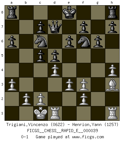 Last move : 0-1 2011 January 19 11:16:55 [Event "FICGS__CHESS__RAPID_E__000039"] [Site "FICGS"] [Date "2010.11.25"] [Round "1"] [White "Trigiani,Vincenzo"] [Black "Henrion,Yann"] [Result "0-1"] [WhiteElo "0622"] [BlackElo "1257"] 1.d4 d5 2.Nc3 Nf6 3.Bf4 a6 4.e3 Nc6 5.Nf3 Bg4 6.Be5 Nxe5 7.h3 Bxf3 8.gxf3 e6 9.h4 Nc6 10.Bh3 g6 11.Qd2 Bb4 12.a3 Bxc3 13.Qxc3 Qd7 14.Qc5 b6 15.O-O-O bxc5 0-1 This chess game has been lost on time (started : 2010.11.25 22:32:33) Queen's pawn : Chigorin variation Queenside Castling by player White (move 15) Player Black won this chess game. Follow this game move after move (download)Chess is a more highly symbolic game, but the aggressions are therefore even more frankly represented in the play. It probably began as a war game; that is, the representation of a miniature battle between the forces of two kingdoms. (Karl Meninger) Sie bekommen vielleicht den Eindruck, dass die Spitzenspieler überhaupt gar nicht so stark sind. Aber das stimmt nicht. Es ist eine Illusion. Mit einem Computer an der Seite ist es sehr leicht, Urteile zu fällen, aber wenn man alleine am Brett sitzt, sieht die Sache ganz anders aus. (Vladimir Kramnik) Debió haber existido una vez en que los hombres eran semidióses, de otra manera no hubiesen podido inventar el Ajedrez. (Gustav Schenk) Je fais ceci parce que dans cinquante coups j'obtiendrai cela; je m'appelle Mikhail Moisevitch Botvinnik. (Botvinnik) I live to kill Traxler counterattack. (Ilmars Cirulis)