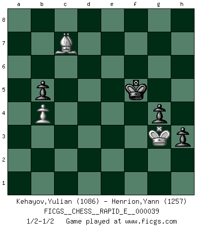 Last move : 1/2-1/2 2011 January 20 22:16:37 [Event "FICGS__CHESS__RAPID_E__000039"] [Site "FICGS"] [Date "2010.11.25"] [Round "1"] [White "Kehayov,Yulian"] [Black "Henrion,Yann"] [Result "1/2-1/2"] [WhiteElo "1086"] [BlackElo "1257"] 1.e4 e5 2.d4 d6 3.dxe5 dxe5 4.Nf3 Nc6 5.Qxd8+ Nxd8 6.Bd3 Nf6 7.O-O Bd6 8.Nc3 O-O 9.Nd5 Nxd5 10.exd5 Re8 11.h3 f6 12.Re1 a6 13.Bd2 b5 14.b4 Bb7 15.c4 c6 16.dxc6 Bxc6 17.cxb5 axb5 18.Be4 Bxe4 19.Rxe4 Nc6 20.Bc3 h6 21.a3 f5 22.Re2 e4 23.Nd4 Nxd4 24.Bxd4 Bxb4 25.axb4 Rxa1+ 26.Bxa1 g5 27.Bd4 Kf7 28.f3 Rd8 29.Bc5 exf3 30.gxf3 Rd3 31.Kg2 h5 32.Kg3 h4+ 33.Kg2 Rb3 34.Rf2 Ke6 35.f4 g4 36.hxg4 fxg4 37.f5+ Kf6 38.Re2 Kxf5 39.Re3 Rxe3 40.Bxe3 h3+ 41.Kg3 Ke4 42.Bc5 Kf5 43.Bd6 Ke6 44.Bb8 Kf5 45.Bc7 Kg5 46.Bf4+ Kf5 47.Be3 Ke4 48.Bh6 Kf5 49.Bf4 Ke4 50.Bc7 Kf5 51.Kh2 Ke4 52.Kg3 Kf5 1/2-1/2 King's pawn game Kingside Castling by player White (move 7) Kingside Castling by player Black (move 8) 10 pieces endgame at move 36 : White KRBPP , Black KRPPP WHITE : King + 1 Rook 1 Bishop 2 Pawns BLACK : King + 1 Rook 3 Pawns 9 pieces endgame at move 38 : White KRBP , Black KRPPP WHITE : King + 1 Rook 1 Bishop 1 Pawn BLACK : King + 1 Rook 3 Pawns 8 pieces endgame at move 39 : White KBP , Black KRPPP WHITE : King + 1 Bishop 1 Pawn BLACK : King + 1 Rook 3 Pawns 7 pieces endgame at move 40 : White KBP , Black KPPP WHITE : King + 1 Bishop 1 Pawn BLACK : King + 3 Pawns This chess game ended in a draw. Follow this game move after move (download)Even the laziest King flees wildly in the face of a double check ! (Aaron Nimzowitsch) Strategie ist, wie man ein Mädchen auf den Rücksitz bekommt. Taktik ist, was man tut, wenn man dann dort ist. (Anonymous) Uno no tiene que jugar muy bien, es suficiente jugar mejor que el oponente. (Siegbert Tarrasch) Les Echecs ne sont pas pour les âmes timides. Ils requièrent un homme entier, qui ne s'arrête pas aveuglément à ce qui a été déjà établi, mais qui tente individuellement de sonder les profondeurs du jeu. (W. Steinitz) Every now and then a man's mind is stretched by a new idea and never shrinks back to its former dimensions. (Oliver Wendell Holmes, Sr.)