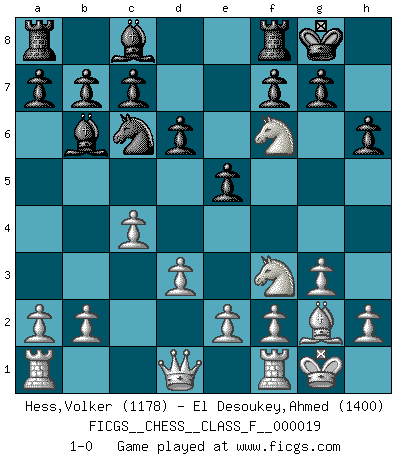 Last move : 1-0 2007 February 7 15:20:15 [Event "FICGS__CHESS__CLASS_F__000019"] [Site "FICGS"] [Date "2006.12.01"] [Round "1"] [White "Hess,Volker"] [Black "El Desoukey,Ahmed"] [Result "1-0"] [WhiteElo "1178"] [BlackElo "1400"] 1.c4 e5 2.Nc3 Nf6 3.d3 Bd6 4.g3 Nc6 5.Bg2 O-O 6.Nf3 Bc5 7.Bg5 d6 8.O-O h6 9.Bxf6 Qxf6 10.Nd5 Bb6 11.Nxf6+ 1-0 English Opening Kingside Castling by player Black (move 5) Kingside Castling by player White (move 8) Player White won this chess game. Follow this game move after move (download)Capture of the adverse King is the ultimate but not the first object of the game. (William Steinitz) Die Auseinandersetzung mit Karpow war politisch geprägt. Er stand für das kommunistische System, wurde von dessen Repräsentanten gehätschelt. Ich war der Oppositionelle. Jeder Schachweltmeister spiegelt auch die gesellschaftlichen Verhältnisse wider. Kramnik steht für die Börsen-Generation des Neuen Markts, ideologiefrei, zahlenfixiert. (Garry Kasparov) En el Ajedrez, cuando menos, el valiente hereda la tierra. (Edmar Mednis) Un journaliste : 'Vous préférez avoir une dame de plus sur l'échiquier ou au lit ?' Boris Spassky : 'Ca dépend de la position.' Animated gif is worth one mega-word. (Unknown)