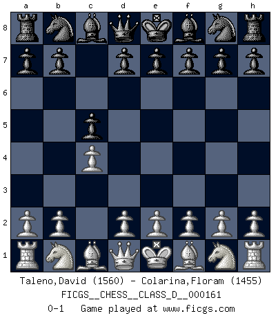 Last move : 0-1 2011 March 21 12:35:33 [Event "FICGS__CHESS__CLASS_D__000161"] [Site "FICGS"] [Date "2010.11.27"] [Round "1"] [White "Taleno,David"] [Black "Colarina,Floram"] [Result "0-1"] [WhiteElo "1560"] [BlackElo "1455"] 1.c4 c5 0-1 English : Symmetrical variation Player Black won this chess game. Follow this game move after move (download)Robert Fischer is a law unto himself. (Larry Evans) Wenn Schach ein enormer Dschungel ist, der seine Myriaden von Geheimnissen nicht preisgeben will, dann sind Computer die Kettensägen einer gewaltigen ökologisch unsensiblen Nutzholzfirma. (Nigel Short) No es una movida, aún la mejor movida que tu debas buscar, sino un plan comprensible. (Eugene Znosko-Borovsky) Fischer est le meilleur joueur du monde et Karpov n'est qu'un joueur de bistrot. (Garry Kasparov, agé de 16 ans) You must do what you feel is right... of course. (Obi-Wan Kenobi in Star Wars ep.4)
