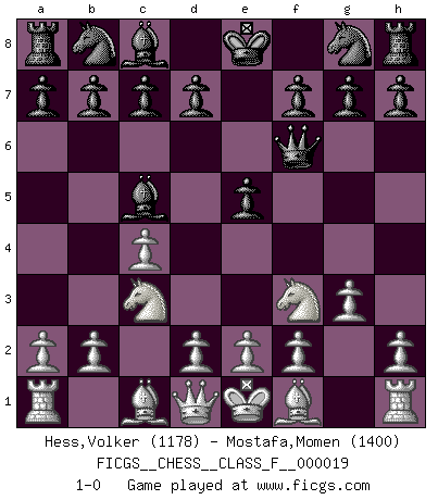 Last move : 1-0 2007 January 11 11:42:36 [Event "FICGS__CHESS__CLASS_F__000019"] [Site "FICGS"] [Date "2006.12.01"] [Round "1"] [White "Hess,Volker"] [Black "Mostafa,Momen"] [Result "1-0"] [WhiteElo "1178"] [BlackElo "1400"] 1.c4 e5 2.Nc3 Qf6 3.g3 Bc5 4.Nf3 1-0 This chess game has been lost on time (started : 2006.12.01 21:5:49) English Opening Player White won this chess game. Follow this game move after move (download)Bobby is the most misunderstood, misquoted celebrity walking the face of this earth. (Yasser Seirawan) Ich kämpfe solange mein Gegner einen Fehler machen kann. (Emanuel Lasker) El Ajedrez es realmente noventa y nueve por ciento calculación. (Soltis) Le pion, dans sa simplicité, marche droit devant lui, mais lorsqu'il prend, il le fait obliquement? Ainsi l'homme, tant qu'il reste pauvre, marche dans la droiture et vit honnêtement, mais lorsqu'il recherche les honneurs, il flatte, se parjure et, par les voies obliques, cherche une position supérieure sur l'échiquier du monde. (Jean de Galles) Creativity is allowing yourself to make mistakes. Art is knowing which ones to keep. (Scott Adams)