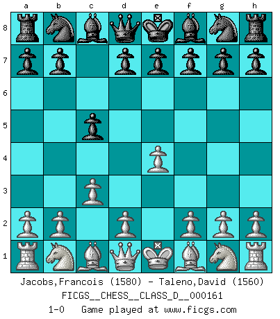 Last move : 1-0 2011 March 20 0:34:18 [Event "FICGS__CHESS__CLASS_D__000161"] [Site "FICGS"] [Date "2010.11.27"] [Round "1"] [White "Jacobs,Francois"] [Black "Taleno,David"] [Result "1-0"] [WhiteElo "1580"] [BlackElo "1560"] 1.e4 c5 2.c3 1-0 Sicilian : Alapin's variation (2.c3) Player White won this chess game. Follow this game move after move (download)Chess holds its master in its own bonds, shackling the mind and brain so that the inner freedom of the very strongest must suffer. (Albert Einstein) Die unerbitterlichsten Regeln im Schach sind die Ausnahmen. (Savielly Grigorievitsch Tartakower) No nos podemos resistir a la fascinación de un sacrificio ya que la pasión por los sacrificios es parte de la naturaleza de un jugador de Ajedrez. (Rudolf Spielman) Tout change constamment, y compris dans le monde des Echecs. (Botvinnik) The good fighters of old first put themselves beyond the possibility of defeat, and then waited for an opportunity of defeating the enemy. (Sun Tzu)
