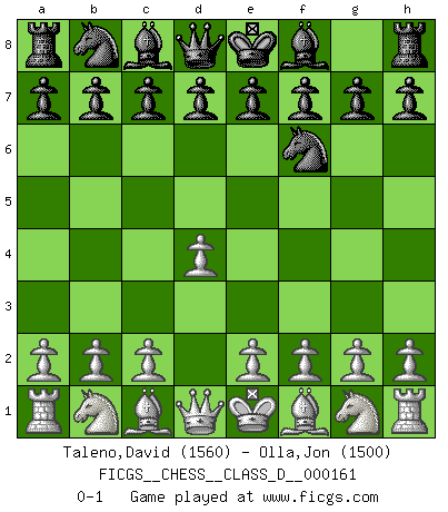 Last move : 0-1 2011 March 22 0:34:44 [Event "FICGS__CHESS__CLASS_D__000161"] [Site "FICGS"] [Date "2010.11.27"] [Round "1"] [White "Taleno,David"] [Black "Olla,Jon"] [Result "0-1"] [WhiteElo "1560"] [BlackElo "1500"] 1.d4 Nf6 0-1 Queen's pawn game Player Black won this chess game. Follow this game move after move (download)The passion for playing Chess is one of the most unaccountable in the world. (H.G. Wells) Kostenjuk hat keinen Sexappeal. (Loek van Wely) Bobby Fischer es el jugador de Ajedrez mas grande que jamás haya existido. (Ken Smith) Le thème de l'attaque double intervient d'une manière ou d'une autre dans l'immense majorité des combinaisons. (Youri Averbakh) There are 10 types of people in this world: those who understand binary and those who don't. (Anonymous)