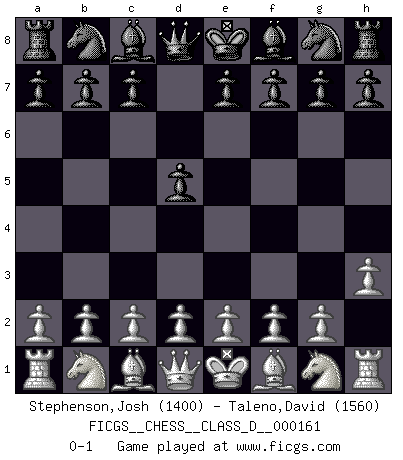 Last move : 0-1 2011 February 26 23:10:34 [Event "FICGS__CHESS__CLASS_D__000161"] [Site "FICGS"] [Date "2010.11.27"] [Round "1"] [White "Stephenson,Josh"] [Black "Taleno,David"] [Result "0-1"] [WhiteElo "1400"] [BlackElo "1560"] 1.h3 d5 0-1 This chess game has been lost on time (started : 2010.11.27 5:15:21) Clemenz (Mead's, Basman's or de Klerk's) Opening Player Black won this chess game. Follow this game move after move (download)It's just you and your opponent at the board and you're trying to prove something. (Bobby Fischer) Darum geht es im Schach. Einen Tag gibst du deinem Gegner eine Lektion, am nächsten Tag gibt er dir eine. (Robert James Fischer) Fischer deseaba darle a los Rusos una sopa de su propia medicina. (Larry Evans) Il s'avisa de me proposer d'apprendre les échecs qu'il jouait un peu... me voilà forcené des échecs. J'achète un échiquier, je m'enferme dans ma chambre, j'y passe des jours et des nuits à vouloir apprendre par cur toutes les parties. (Jean-Jacques Rousseau, Confessions) I fear not the man who has practiced 10,000 kicks once, but I fear the man who has practiced one kick 10,000 times. (Bruce Lee)
