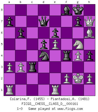 Last move : 1-0 2011 February 1 9:17:22 [Event "FICGS__CHESS__CLASS_D__000161"] [Site "FICGS"] [Date "2010.11.27"] [Round "1"] [White "Colarina,Floram"] [Black "Piantadosi,Angelo"] [Result "1-0"] [WhiteElo "1455"] [BlackElo "1481"] 1.e4 e6 2.d4 d5 3.e5 c5 4.c3 Nc6 5.Nf3 Qb6 6.Be2 Bd7 7.O-O cxd4 8.cxd4 Nge7 9.b3 Ng6 10.Nc3 Be7 11.Re1 O-O 12.Na4 Qd8 13.g3 b6 14.Nc3 Rc8 15.a3 h5 16.Bd2 h4 17.Kg2 f5 18.Ng1 f4 19.Bh5 Be8 20.Qg4 Ngxe5 21.dxe5 Bxh5 22.Qxh5 Rf5 23.Qg6 Qd7 24.Bxf4 Nd4 25.Bh6 Bf8 26.g4 Rf7 27.Nh3 Rxc3 28.Ng5 Rf4 29.Qh7+ 1-0 French : Advance, Paulsen attack Kingside Castling by player White (move 7) Kingside Castling by player Black (move 11) Player White won this chess game. Follow this game move after move (download)Avoid the crowd. Do your own thinking independently. Be the Chess player, not the Chess piece. (Ralph Charell) Schach ist mein Leben, meine Leidenschaft, was ich gelernt habe und seit meinem 14. Lebensjahr profimässig praktiziere. Darauf zu verzichten, würde mir sehr schwer fallen. (Viktor Kortschnoi) El Ajedrez es una hermosa aventura. (Bent Larsen) Des points faibles ou des trous dans la position de l'adversaire doivent être occupés par des pièces et non pas par des pions. (Siegbert Tarrasch) Vladimir Ras-Putin is still alive... He is also a good actor, I saw him in the Lord of the Rings. (Rodolfo d'Ettorre)