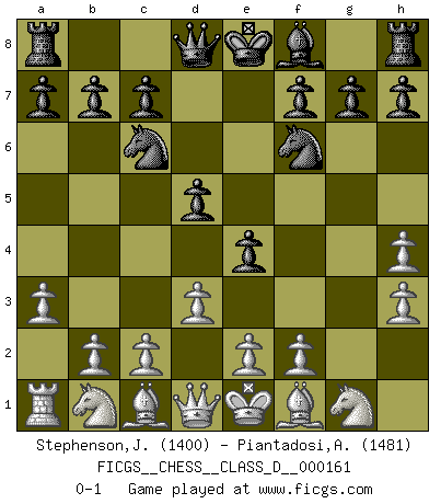 Last move : 0-1 2011 January 12 23:0:32 [Event "FICGS__CHESS__CLASS_D__000161"] [Site "FICGS"] [Date "2010.11.27"] [Round "1"] [White "Stephenson,Josh"] [Black "Piantadosi,Angelo"] [Result "0-1"] [WhiteElo "1400"] [BlackElo "1481"] 1.h3 e5 2.a3 d5 3.h4 Nf6 4.Rh3 Bxh3 5.gxh3 Nc6 6.d3 e4 0-1 This chess game has been lost on time (started : 2010.11.27 5:15:21) Global Opening Player Black won this chess game. Follow this game move after move (download)Nonsense was the last thing Fischer was interested in, as far as Chess was concerned. (Elie Agur) Gegen einen Schachcomputer zu verlieren ist wie Löcher in den Strümpfen zuhaben. Es ist nicht peinlich, solange man der einzige ist der es weiß. (Anonymous) Siempre es mucho mejor sacrificar las piezas de tu oponente. (Savielly Tartakover) Les échecs sont plus proches de l'art de l'assassinat que de l'art de la guerre. (Arturo Perez-Reverte) When you've done things right people won't know you've done anything at all. (Futurama)
