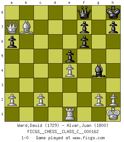 Last move : 1-0 2011 March 14 14:48:22 [Event "FICGS__CHESS__CLASS_C__000162"] [Site "FICGS"] [Date "2010.11.27"] [Round "1"] [White "Ward,David"] [Black "Alvar,Juan"] [Result "1-0"] [WhiteElo "1729"] [BlackElo "1800"] 1.e4 c5 2.Nf3 d6 3.d4 cxd4 4.Nxd4 Nf6 5.Nc3 a6 6.Bc4 Qc7 7.Bb3 Nc6 8.O-O e6 9.f4 Be7 10.Kh1 O-O 11.Be3 Nxd4 12.Bxd4 e5 13.fxe5 dxe5 14.Be3 Bg4 15.Qe1 Bb4 16.Rxf6 Bxc3 17.bxc3 gxf6 18.Qg3 Qxc3 19.Re1 Kh8 20.Qf2 Qc6 21.Bd5 Qd6 22.Bc5 Qd8 23.Bxf8 Qxf8 24.Bxb7 Ra7 25.Qxa7 1-0 Sicilian : Najdorf, Lipnitzky attack Kingside Castling by player White (move 8) Kingside Castling by player Black (move 10) Player White won this chess game. Follow this game move after move (download)A Chess game is divided into three stages: the first, when you hope you have the advantage, the second when you believe you have an advantage, and the third... when you know you're going to lose ! (Savielly Tartakower) Man braucht nicht immer den besten Zug zu spielen: Ein Zug muß aktiv, unternehmungslustig, korrekt und schön sein. (David Bronstein) Fischer no está bajo la obligación de nadie. (Joseph Platz) Toutes les manuvres exécutées sur une colonne ouverte ont pour but ultime l'intrusion définitive sur la septième ou la huitième rangée, en plein cur de la position ennemie. (Aaron Nimzovitch) Thibault, I ask for draw. Game 13876. - Sorry Ilmars, you won. (FICGS chat)