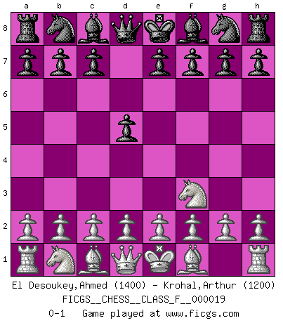 Last move : 0-1 2007 January 19 0:39:6 [Event "FICGS__CHESS__CLASS_F__000019"] [Site "FICGS"] [Date "2006.12.01"] [Round "1"] [White "El Desoukey,Ahmed"] [Black "Krohal,Arthur"] [Result "0-1"] [WhiteElo "1400"] [BlackElo "1200"] 1.Nf3 d5 0-1 This chess game has been lost on time (started : 2006.12.01 21:5:49) Reti Opening Player Black won this chess game. Follow this game move after move (download)He who takes the Queen's Knight's Pawn will sleep in the streets. (Anonymous) Ich bin stolz ein Bulgare zu sein. (Veselin Topalov) Todo se encuentra en un estado de flujo y esto incluye al mundo del Ajedrez. (Mikhail Botvinnik) Un footballeur joue avec ses pieds, parfois avec sa tête. Un joueur d'échecs ne joue qu'avec sa tête. Et quand il ne joue plus, il meurt. (Jacob Murray) What doesn't kill us makes us stronger. (Friedrich Nietzsche)