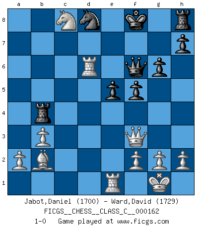 Last move : 1-0 2011 March 1 4:19:5 [Event "FICGS__CHESS__CLASS_C__000162"] [Site "FICGS"] [Date "2010.11.27"] [Round "1"] [White "Jabot,Daniel"] [Black "Ward,David"] [Result "1-0"] [WhiteElo "1700"] [BlackElo "1729"] 1.e4 e5 2.Nf3 Nc6 3.d4 exd4 4.Nxd4 Nf6 5.Nxc6 bxc6 6.e5 Qe7 7.Qe2 Nd5 8.c4 Ba6 9.b3 d6 10.Qe4 Nb6 11.Qxc6+ Kd8 12.Bb2 Rb8 13.Qf3 dxe5 14.Nc3 Bb7 15.Rd1+ Nd7 16.Qg3 f6 17.Qh3 Qf7 18.Bd3 Bd6 19.O-O g6 20.Be4 f5 21.Qf3 Nc5 22.Bxb7 Nxb7 23.Nb5 Ke7 24.Rfe1 Qf6 25.Nxa7 Nd8 26.c5 Rb4 27.cxd6+ cxd6 28.Nc8+ Kf8 29.Rxd6 1-0 Scotch : Mieses variation Kingside Castling by player White (move 19) Player White won this chess game. Follow this game move after move (download)Checkers is for tramps. (Paul Morphy) Wenn Capablanka heute auf der Schachbühne erscheinen würde, hätte er ein halbes Jahr gebraucht um sich die Schachtheorie anzueignen. Und dann hätte er alles und jeden besiegt. (Mikhail Moiseyevich Botvinik) Hay dos clases de hombres: aquellos que se conforman en dejarse llevar por las circunstancias y que juegan barajas y aquellos decididos a controlar las circunstancias y que juegan al Ajedrez. (Mortimer Collins) Je ne crois pas en la psychologie, je crois aux bons coups. (Robert Fischer) He who is a good ruler must first have been ruled. (Aristotle)
