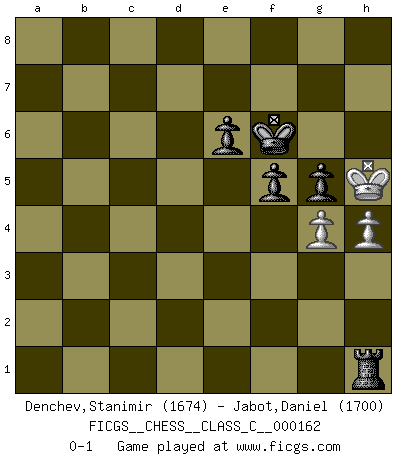 Last move : 0-1 2011 March 25 9:11:27 [Event "FICGS__CHESS__CLASS_C__000162"] [Site "FICGS"] [Date "2010.11.27"] [Round "1"] [White "Denchev,Stanimir"] [Black "Jabot,Daniel"] [Result "0-1"] [WhiteElo "1674"] [BlackElo "1700"] 1.d4 d5 2.c4 c6 3.Nf3 Nf6 4.Nc3 e6 5.Bg5 h6 6.Bxf6 Qxf6 7.e4 dxe4 8.Nxe4 Bb4+ 9.Nc3 c5 10.Be2 cxd4 11.Nxd4 Bxc3+ 12.bxc3 Nd7 13.O-O O-O 14.Bf3 Ne5 15.c5 Qe7 16.c6 Nxf3+ 17.Qxf3 bxc6 18.Nxc6 Qc5 19.Ne7+ Qxe7 20.Qxa8 Ba6 21.Qe4 Bxf1 22.Kxf1 Qc7 23.h3 Qxc3 24.Rb1 Rc8 25.Qe3 Qc4+ 26.Qe2 Qxe2+ 27.Kxe2 Rc2+ 28.Ke3 Rxa2 29.Rb8+ Kh7 30.Rb7 Kg6 31.g3 a5 32.Ra7 a4 33.f4 a3 34.Kf3 Ra1 35.Ra6 a2 36.Kg4 f5+ 37.Kh4 Kf6 38.Ra5 g5+ 39.Kh5 Rh1 40.h4 a1Q 41.Rxa1 Rxa1 42.g4 Rh1 43.fxg5+ hxg5 0-1 QGD Slav : 4.Nc3 Kingside Castling by player White (move 13) Kingside Castling by player Black (move 13) Promotion Queen by player Black (move 40) 10 pieces endgame at move 41 : White KPPP , Black KRPPPP WHITE : King + 3 Pawns BLACK : King + 1 Rook 4 Pawns 9 pieces endgame at move 43 : White KPPP , Black KRPPP WHITE : King + 3 Pawns BLACK : King + 1 Rook 3 Pawns 8 pieces endgame at move 43 : White KPP , Black KRPPP WHITE : King + 2 Pawns BLACK : King + 1 Rook 3 Pawns Player Black won this chess game. Follow this game move after move (download)Becoming successful at Chess allows you to discover your own personality. That's what I want for the kids I teach. (Saudin Robovic) Die größte Kunst beim Schach besteht darin dem Gegner nicht zu zeigen was er tun kann. (Garry Kasparov) Si tu oponente no puede hacer nada activo, entonces no apures la posición; En vez de eso, dejalo estar sentado ahí, sufriendo y rogandote por un empate. (Jeremy Silman) Même si l'adversaire joue le coup analysé précédemment, recommencez l'analyse en voyant la nouvelle position. Première règle de Blumenfeld If you are going through hell, keep going. (Winston Churchill)