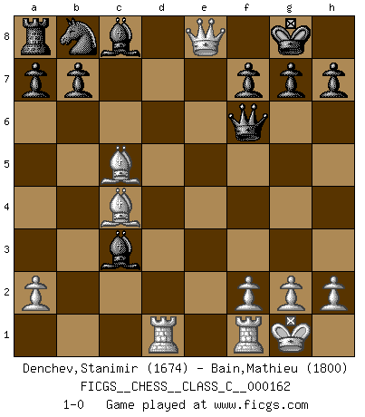 Last move : 1-0 2011 January 20 19:15:46 [Event "FICGS__CHESS__CLASS_C__000162"] [Site "FICGS"] [Date "2010.11.27"] [Round "1"] [White "Denchev,Stanimir"] [Black "Bain,Mathieu"] [Result "1-0"] [WhiteElo "1674"] [BlackElo "1800"] 1.d4 d5 2.c4 c6 3.Nf3 Nf6 4.Nc3 dxc4 5.e4 e6 6.Bxc4 Bb4 7.Qe2 c5 8.Be3 Nxe4 9.O-O Nxc3 10.bxc3 Bxc3 11.Rad1 cxd4 12.Nxd4 O-O 13.Nxe6 Qf6 14.Nxf8 Kxf8 15.Bc5+ Kg8 16.Qe8+ 1-0 QGD Slav : Slav gambit Kingside Castling by player White (move 9) Kingside Castling by player Black (move 12) Player White won this chess game. Follow this game move after move (download)All that matters on the Chessboard is good moves. (Bobby Fischer) Wer nie einen Fehler gemacht hat, hat nie etwas Neues ausprobiert. (Albert Einstein) El Ajedrez es un juego de pelea el cual es puramente intelectual e incluye la suerte. (Richard Reti) Il n'y a pas eu de défaite parce que je ne crois pas que cet ordinateur ait jamais existé. IBM a triché en refusant d'imprimer les modes de recherche de la machine. C'est évident, pendant le match, des coups décisifs ont été joués par des êtres humains. Aujourd'hui, les meilleurs spécialistes en informatique ne peuvent toujours pas expliquer comment Deep-Blue a pu jouer contre la logique des ordinateurs. IBM a gagné une guerre de communication, mais ils sont incapables de prouver que l'ordinateur a gagné tout seul. (Garry Kasparov) When the going gets tactical, the computers get going. (Hyatt)
