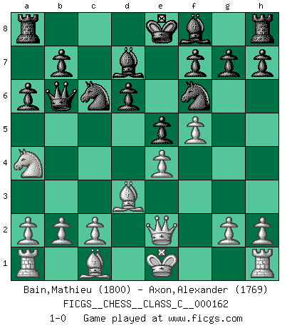 Last move : 1-0 2011 March 8 23:39:21 [Event "FICGS__CHESS__CLASS_C__000162"] [Site "FICGS"] [Date "2010.11.27"] [Round "1"] [White "Bain,Mathieu"] [Black "Axon,Alexander"] [Result "1-0"] [WhiteElo "1800"] [BlackElo "1769"] 1.e4 c5 2.Nf3 d6 3.d4 cxd4 4.Nxd4 Nf6 5.Nc3 a6 6.Bd3 e5 7.Nf5 Bxf5 8.f3 Be6 9.f4 Qb6 10.f5 Bd7 11.Qe2 Nc6 12.Na4 1-0 Sicilian : Najdorf Player White won this chess game. Follow this game move after move (download)Chess mastery essentially consists of analyzing Chess positions accurately. (Mikhail Botvinnik) Wenn Spassky eine Figur opfert kannst du genauso gut aufgeben. Aber wenn Tal eine Figur opfert, spiel weiter. Er könnte noch eine weitere opfern, und dann ... wer weiß? (Miguel Najdorf) Bendita sea la memoria de aquel que dio al mundo este juego inmortal. (A. G. Gardiner) L'attaque fait le spectacle, la défense gagne les matchs. (Dicton footballistique) Hold em is to stud what chess is to checkers. (Johnny Moss)