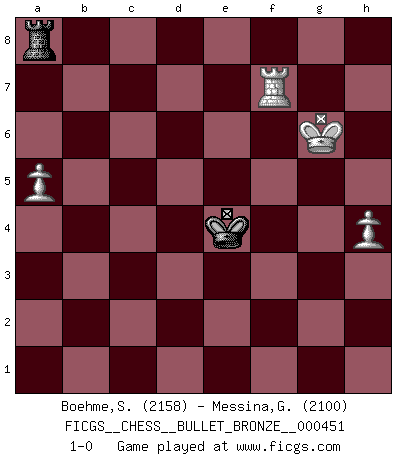 Last move : 1-0 2010 November 27 23:42:33 [Event "FICGS__CHESS__BULLET_BRONZE__000451"] [Site "FICGS"] [Date "2010.11.27"] [Round "1"] [White "Boehme,Sebastian"] [Black "Messina,Giuseppe"] [Result "1-0"] [WhiteElo "2158"] [BlackElo "2100"] 1.e4 e5 2.Nf3 Nc6 3.Bb5 Bc5 4.c3 Nf6 5.O-O O-O 6.d4 Bb6 7.Bg5 h6 8.Bh4 exd4 9.Qc1 Qe8 10.Bxf6 gxf6 11.Qf4 Qe6 12.Bxc6 dxc3 13.Nxc3 bxc6 14.Qxh6 d6 15.Rfe1 f5 16.Qf4 Qg6 17.h3 Kh7 18.exf5 Qxf5 19.Qh4+ Kg7 20.Re7 Qf6 21.Qg3+ Qg6 22.Ng5 Kg8 23.Qh4 Bf5 24.Rae1 Rab8 25.Nf3 Kg7 26.Ne4 Rh8 27.Qf4 Bxe4 28.R1xe4 Rh5 29.g4 Rf8 30.Kg2 Kg8 31.Nd4 Bxd4 32.Rxd4 f5 33.Rxc7 fxg4 34.Qxg4 Rf6 35.Rxc6 Rg5 36.Qxg5 Qxg5+ 37.Rg4 Rg6 38.Rxg5 Rxg5+ 39.Kf3 Rf5+ 40.Kg3 Rg5+ 41.Kf4 Ra5 42.a3 Rb5 43.Rxd6 Rxb2 44.Rd8+ Kf7 45.Rd7+ Ke6 46.Rxa7 Rxf2+ 47.Kg4 Rg2+ 48.Kh5 Rg8 49.h4 Ke5 50.a4 Kf4 51.Rf7+ Ke4 52.a5 Ra8 53.Kg6 1-0 Ruy Lopez : Classical defense, Benelux variation Kingside Castling by player White (move 5) Kingside Castling by player Black (move 5) 10 pieces endgame at move 38 : White KRPPPP , Black KRPP WHITE : King + 1 Rook 4 Pawns BLACK : King + 1 Rook 2 Pawns 9 pieces endgame at move 43 : White KRPPPP , Black KRP WHITE : King + 1 Rook 4 Pawns BLACK : King + 1 Rook 1 Pawn 8 pieces endgame at move 43 : White KRPPP , Black KRP WHITE : King + 1 Rook 3 Pawns BLACK : King + 1 Rook 1 Pawn 7 pieces endgame at move 46 : White KRPPP , Black KR WHITE : King + 1 Rook 3 Pawns BLACK : King + 1 Rook 6 pieces endgame at move 46 : White KRPP , Black KR WHITE : King + 1 Rook 2 Pawns BLACK : King + 1 Rook Player White won this chess game. Follow this game move after move (download)Chess is thirty to forty percent psychology. You don't have this when you play a computer. I can't confuse it. (Judith Polgar) Fischer: 'Remis!?' Uhlmann: 'Aber es muss doch dreimal Zugwiederholung sein!' Fischer: 'Sie nehmen das Remis an, wie ich es sage, sonst spiele ich weiter und werde Sie dann schlagen!' (Robert James Fischer) Bobby Fischer es el mas grande genio de Ajedrez de todos los tiempos. (Alexander Kotov) Les réformistes prétendent que les progrès de la théorie conduiront à la disparition des échecs, et qu'il faut, pour leur rendre vie, en remanier les règles. En réalité, qu'exprime cette affirmation? Le mépris de l'intuition, de l'imagination et de tous les autres éléments qui font des échecs un art. (Alexander Alekhine) Luck never made a man wise. (Seneca, Letters to Lucilius)