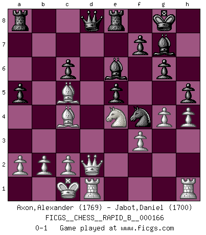Last move : 0-1 2011 January 30 11:41:26 [Event "FICGS__CHESS__RAPID_B__000166"] [Site "FICGS"] [Date "2010.11.29"] [Round "1"] [White "Axon,Alexander"] [Black "Jabot,Daniel"] [Result "0-1"] [WhiteElo "1769"] [BlackElo "1700"] 1.e4 c5 2.Nf3 d6 3.d4 cxd4 4.Nxd4 Nf6 5.Nc3 g6 6.Be3 Bg7 7.f3 O-O 8.Qd2 Nc6 9.O-O-O d5 10.exd5 Nxd5 11.Nxc6 bxc6 12.Bd4 e5 13.Bc5 Be6 14.Ne4 Re8 15.h4 h5 16.Bc4 a5 17.g4 Nf4 0-1 This chess game has been lost on time (started : 2010.11.29 16:44:22) Sicilian : Dragon, Yugoslav attack, 7...O-O Kingside Castling by player Black (move 7) Queenside Castling by player White (move 9) Player Black won this chess game. Follow this game move after move (download)Some part of a mistake is always correct. (Savielly Tartakover) Die Auseinandersetzung mit Karpow war politisch geprägt. Er stand für das kommunistische System, wurde von dessen Repräsentanten gehätschelt. Ich war der Oppositionelle. Jeder Schachweltmeister spiegelt auch die gesellschaftlichen Verhältnisse wider. Kramnik steht für die Börsen-Generation des Neuen Markts, ideologiefrei, zahlenfixiert. (Garry Kasparov) Es el objetivo de la escuela moderna no tratar cada posición de acuerdo a una regla general, sino de acuerdo al principio inherente en la posición. (Richard Reti) C'est la seule position que je connaisse où les deux camps sont mals. Propos prêtés à V. Anand. Pushing plastic is for the many, pushing virtual pieces is for the fewer, pushing wood is for the very few. (Normajean Yates)