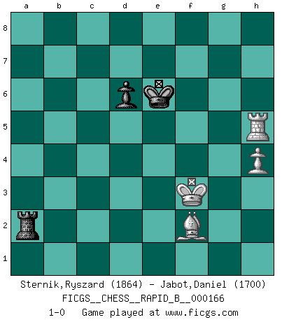 Last move : 1-0 2011 February 13 10:36:12 [Event "FICGS__CHESS__RAPID_B__000166"] [Site "FICGS"] [Date "2010.11.29"] [Round "1"] [White "Sternik,Ryszard"] [Black "Jabot,Daniel"] [Result "1-0"] [WhiteElo "1864"] [BlackElo "1700"] 1.e4 c5 2.Nc3 d6 3.Nf3 Nf6 4.d4 cxd4 5.Nxd4 g6 6.Be3 Bg7 7.Be2 Nc6 8.Rb1 Ng4 9.Bxg4 Bxg4 10.Nxc6 Bxd1 11.Nxd8 Bxc2 12.Rc1 Bxc3+ 13.bxc3 Bxe4 14.f3 Bxf3 15.gxf3 Kxd8 16.c4 Rc8 17.Ke2 Kd7 18.Rhd1 Rc6 19.c5 Rhc8 20.Rb1 b6 21.cxb6 Rc2+ 22.Rd2 axb6 23.Rxb6 R2c3 24.Ra6 R8c6 25.Ra7+ Rc7 26.Ra5 Rc1 27.a4 Rh1 28.Kd3 Ra1 29.Bb6 Ra3+ 30.Ke2 Rc4 31.Ra7+ Ke8 32.a5 Rh4 33.Kd1 Ra1+ 34.Kc2 Ra2+ 35.Kc1 Rc4+ 36.Kd1 Ra1+ 37.Ke2 Rh4 38.Ke3 f5 39.a6 Ra3+ 40.Rd3 Ra2 41.Ra8+ Kf7 42.Rb3 Rha4 43.a7 h6 44.Rh8 e5 45.Kd3 h5 46.h4 Ke6 47.Rg8 Kf7 48.Rb8 Ke6 49.Rc3 Ra1 50.Rc7 R1a3+ 51.Ke2 Ra2+ 52.Kf1 Ra1+ 53.Kg2 R1a2+ 54.Bf2 e4 55.Re8+ Kd5 56.Rce7 Kc6 57.Rg7 Kd5 58.fxe4+ fxe4 59.R8e7 R4a3 60.Rxg6 e3 61.a8Q+ Rxa8 62.Rg5+ Kc6 63.Rxe3 R8a5 64.Rc3+ Kd7 65.Rd3 Kc7 66.Rgd5 Rxd5 67.Rxd5 Kd7 68.Rxh5 Ke6 69.Kf3 1-0 Sicilian : Closed Promotion Queen by player White (move 61) 10 pieces endgame at move 63 : White KRRBP , Black KRRPP WHITE : King + 2 Rooks 1 Bishop 1 Pawn BLACK : King + 2 Rooks 2 Pawns 9 pieces endgame at move 66 : White KRBP , Black KRRPP WHITE : King + 1 Rook 1 Bishop 1 Pawn BLACK : King + 2 Rooks 2 Pawns 8 pieces endgame at move 67 : White KRBP , Black KRPP WHITE : King + 1 Rook 1 Bishop 1 Pawn BLACK : King + 1 Rook 2 Pawns 7 pieces endgame at move 68 : White KRBP , Black KRP WHITE : King + 1 Rook 1 Bishop 1 Pawn BLACK : King + 1 Rook 1 Pawn Player White won this chess game. Follow this game move after move (download)Chess is thirty to forty percent psychology. You don't have this when you play a computer. I can't confuse it. (Judith Polgar) Du kannst im Schach nur gut werden, wenn du das Spiel liebst. (Robert James Fischer) Solo los afeminados hacen el Enroque. (Rob Sillars) Le pion, dans sa simplicité, marche droit devant lui, mais lorsqu'il prend, il le fait obliquement? Ainsi l'homme, tant qu'il reste pauvre, marche dans la droiture et vit honnêtement, mais lorsqu'il recherche les honneurs, il flatte, se parjure et, par les voies obliques, cherche une position supérieure sur l'échiquier du monde. (Jean de Galles) Don't be discouraged. It's often the last key in the bunch that opens the lock. (Author unknown)