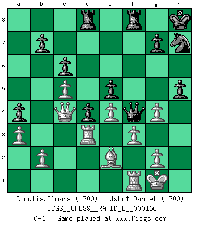 Last move : 0-1 2011 April 5 14:51:55 [Event "FICGS__CHESS__RAPID_B__000166"] [Site "FICGS"] [Date "2010.11.29"] [Round "1"] [White "Cirulis,Ilmars"] [Black "Jabot,Daniel"] [Result "0-1"] [WhiteElo "1700"] [BlackElo "1700"] 1.c4 e5 2.e4 Nc6 3.a3 a5 4.Nf3 Bc5 5.Be2 d6 6.d3 f5 7.Be3 fxe4 8.dxe4 Nf6 9.Nc3 O-O 10.O-O Bg4 11.Rb1 h6 12.h3 Be6 13.Qd3 Nd7 14.Nd5 a4 15.Rbd1 Na5 16.Bd2 Nb3 17.Bb4 c6 18.Ne3 Qf6 19.Bxc5 dxc5 20.Rde1 Rad8 21.Ng4 Bxg4 22.hxg4 Qf4 23.Rd1 Nd4 24.Nxd4 cxd4 25.c5 Nf6 26.f3 h5 27.Qc4+ Kh8 28.Rd3 Nh7 0-1 English Opening Kingside Castling by player Black (move 9) Kingside Castling by player White (move 10) Player Black won this chess game. Follow this game move after move (download)The tactician knows what to do when there is something to do; whereas the strategian knows what to do when there is nothing to do. (Gerald Abrahams) Der Bart als Geschlechtszeichen mitten im Gesicht ist obszön. Daher gefällt er den Weibern. [Zugegeben, kein Schachzitat, aber unglaublich originell] (Arthur Schopenhauer) Algunos sacrificios son sólidos, los demás son míos. (Mikhail Tal) On n'a jamais que l'âge auquel on a commence à jouer aux échecs car après on cesse de vieillir. (Capablanca) Real knowledge is to know the extent of one's ignorance. (Confucius)