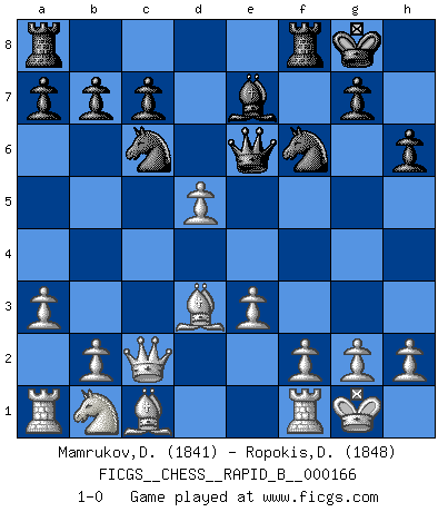 Last move : 1-0 2010 December 11 13:27:38 [Event "FICGS__CHESS__RAPID_B__000166"] [Site "FICGS"] [Date "2010.11.29"] [Round "1"] [White "Mamrukov,Dmitri"] [Black "Ropokis,Dimitrios"] [Result "1-0"] [WhiteElo "1841"] [BlackElo "1848"] 1.d4 Nf6 2.c4 e5 3.dxe5 Ne4 4.a3 Nc6 5.Nf3 Be7 6.Qc2 d5 7.e3 Be6 8.Be2 O-O 9.O-O Qd7 10.Bd3 f5 11.exf6 Nxf6 12.Ng5 h6 13.Nxe6 Qxe6 14.cxd5 1-0 Budapest : Fajarowicz variation Kingside Castling by player Black (move 8) Kingside Castling by player White (move 9) Player White won this chess game. Follow this game move after move (download)Is Bobby Fischer quite sane ? (Salo Flohr) Die Arbeit ist etwas Unnatürliches. Die Faulheit allein ist göttlich. (Anatole France) El Ajedrez es un invernadero donde los frutos del carácter pueden madurar mas completamente que en la vida. (Edward Morgan Foster) Karpov est une pièce de musée. (Garry Kasparov) Unless I accept my faults I will most certainly doubt my virtues. (Hugh Prather)