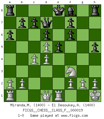 Last move : 1-0 2007 February 7 9:16:45 [Event "FICGS__CHESS__CLASS_F__000019"] [Site "FICGS"] [Date "2006.12.01"] [Round "1"] [White "Miranda,Marcus"] [Black "El Desoukey,Ahmed"] [Result "1-0"] [WhiteElo "1400"] [BlackElo "1400"] 1.e4 e5 2.Nf3 Nc6 3.Bb5 d6 4.d4 Bd7 5.Nc3 Nf6 6.O-O a6 7.Bxc6 Bxc6 8.Re1 Qe7 9.Bg5 h6 10.Bxf6 gxf6 11.Nd5 Bxd5 12.exd5 Qd7 13.c4 h5 14.Kh1 1-0 Ruy Lopez : Old Steinitz defense Kingside Castling by player White (move 6) Player White won this chess game. Follow this game move after move (download)Chess is war over the board. The object is to crush the opponents mind. (Bobby Fischer) Wer mein Gambit spielt, muß bereit sein, alle Brücken hinter sich abzubrechen. Es verändert den ganzen Menschen. Es wirkt wie ein Zauberstab und fördert verkümmerte, gute Charakter- eigenschaften wieder zu Tage. (Emil Joseph Diemer) Nunca antes ha habido un jugador de Ajedrez con tal conocimiento a fondo de las complejidades del juego y una inmensa voluntad absolutamente indomable de ganar. Yo pienso que Fischer es el jugador mas grande que jamás haya existido. (Lisa Lane) Il vaut mieux sacrifier les pièces de l'adversaire. (Xavier Tartacover) Statistics can be made to prove anything - even the truth. (Author unknown)