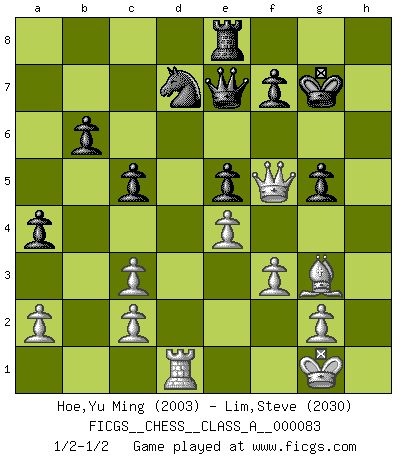 Last move : 1/2-1/2 2011 February 2 5:44:52 [Event "FICGS__CHESS__CLASS_A__000083"] [Site "FICGS"] [Date "2010.12.01"] [Round "1"] [White "Hoe,Yu Ming"] [Black "Lim,Steve"] [Result "1/2-1/2"] [WhiteElo "2003"] [BlackElo "2030"] 1.e4 e5 2.Nf3 Nc6 3.Bb5 Nf6 4.Nc3 Bb4 5.O-O O-O 6.d3 d6 7.Bg5 Bxc3 8.bxc3 Qe7 9.Re1 h6 10.Bh4 a6 11.Bxc6 bxc6 12.Rb1 g5 13.Bg3 Bg4 14.h3 Bh5 15.d4 Rfb8 16.Rb3 Nd7 17.Qd3 Bxf3 18.Qxf3 a5 19.Reb1 Rb6 20.dxe5 dxe5 21.Qf5 Re8 22.h4 Kg7 23.f3 a4 24.Rb4 c5 25.Rxb6 cxb6 26.hxg5 hxg5 27.Rd1 1/2-1/2 Ruy Lopez : Berlin defense Kingside Castling by player White (move 5) Kingside Castling by player Black (move 5) This chess game ended in a draw. Follow this game move after move (download)Life is a kind of Chess, with struggle, competition, good and ill events. (Benjamin Franklin) Je älter ich werde, um so mehr schätze ich die Bauern. (Paul Keres) El poder defensivo de una pieza clavada, solamente es imaginario. (Aaron Nimzovich) Les sacrifices démontrent seulement que quelqu'un a gaffé. (Savielly Tartacover) You can't play chess if you're groggy from pills. (Anatoly Karpov)