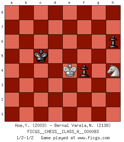 Last move : 1/2-1/2 2011 April 17 2:9:5 [Event "FICGS__CHESS__CLASS_A__000083"] [Site "FICGS"] [Date "2010.12.01"] [Round "1"] [White "Hoe,Yu Ming"] [Black "Bernal Varela,Nelson"] [Result "1/2-1/2"] [WhiteElo "2003"] [BlackElo "2138"] 1.e4 c5 2.Nf3 d6 3.d4 cxd4 4.Nxd4 Nf6 5.Nc3 a6 6.Be3 e5 7.Nb3 Be6 8.f3 Nbd7 9.Qd2 b5 10.O-O-O b4 11.Nd5 Bxd5 12.exd5 a5 13.Bb5 a4 14.Na1 a3 15.Qxb4 axb2+ 16.Kxb2 Be7 17.a4 O-O 18.Nb3 Qc7 19.Qc3 Qb8 20.Bc6 Rc8 21.Qd2 Ra6 22.Qe2 R8xc6 23.dxc6 Rxc6 24.Qb5 Qc8 25.c3 Rc7 26.a5 Rb7 27.Qa4 Nb8 28.Rhe1 h6 29.f4 Nfd7 30.fxe5 dxe5 31.Rd5 Na6 32.Re2 Ndc5 33.Bxc5 Nxc5 34.Rxc5 Bxc5 35.Rxe5 Bf8 36.a6 Ra7 37.Re8 Qxa6 38.Qxa6 Rxa6 39.c4 f5 40.Rb8 Kf7 41.c5 g5 42.Rb7+ Ke6 43.Rb6+ Rxb6 44.cxb6 Kd6 45.Kc3 Kc6 46.Nd4+ Kxb6 47.g3 f4 48.gxf4 gxf4 49.Kd3 Be7 50.Ke4 Kc5 51.Nf5 Bg5 52.h4 Bxh4 53.Nxh4 1/2-1/2 Sicilian : Najdorf, Byrne (English) attack Queenside Castling by player White (move 10) Kingside Castling by player Black (move 17) 10 pieces endgame at move 44 : White KNPPP , Black KBPPP WHITE : King + 1 Knight 3 Pawns BLACK : King + 1 Bishop 3 Pawns 9 pieces endgame at move 46 : White KNPP , Black KBPPP WHITE : King + 1 Knight 2 Pawns BLACK : King + 1 Bishop 3 Pawns 8 pieces endgame at move 48 : White KNPP , Black KBPP WHITE : King + 1 Knight 2 Pawns BLACK : King + 1 Bishop 2 Pawns 7 pieces endgame at move 48 : White KNP , Black KBPP WHITE : King + 1 Knight 1 Pawn BLACK : King + 1 Bishop 2 Pawns 6 pieces endgame at move 52 : White KN , Black KBPP WHITE : King + 1 Knight BLACK : King + 1 Bishop 2 Pawns 5 pieces endgame at move 53 : White KN , Black KPP WHITE : King + 1 Knight BLACK : King + 2 Pawns This chess game ended in a draw. Follow this game move after move (download)It's always better to sacrifice your opponent's men. (Savielly Tartakover) Du musst Deinen Gegner in einen tiefen dunklen Wald führen wo 2+2=5 ist und wo der Weg, der wieder hinausführt, nur breit genug für einen ist. (Mikhail Nekhemyevich Tal) El jugador táctico sabe que hacer cuando hay algo que hacer; mientras que el estratega sabe que hacer cuando no hay nada que hacer. (Gerald Abrahams) Mais l'homme est une créature légère et illogique : semblable au joueur d'échecs, il n'aime que le processus du but à atteindre, non le but lui-même. (Dostoïevsky) A generalist learns less and less about more and more until he knows nothing about everything. (Author unknown)