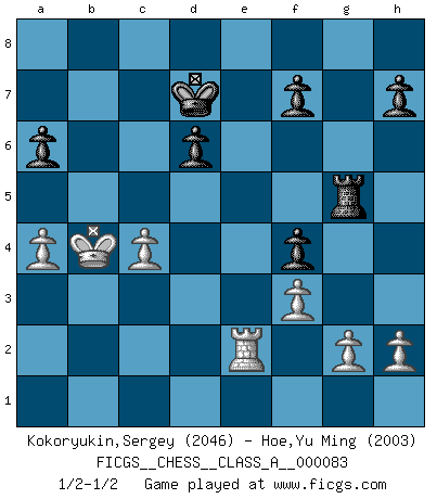 Last move : 1/2-1/2 2011 February 15 9:8:46 [Event "FICGS__CHESS__CLASS_A__000083"] [Site "FICGS"] [Date "2010.12.01"] [Round "1"] [White "Kokoryukin,Sergey"] [Black "Hoe,Yu Ming"] [Result "1/2-1/2"] [WhiteElo "2046"] [BlackElo "2003"] 1.e4 c5 2.Nf3 Nc6 3.d4 cxd4 4.Nxd4 Nf6 5.Nc3 e5 6.Ndb5 d6 7.Bg5 a6 8.Na3 b5 9.Bxf6 gxf6 10.Nd5 f5 11.Bd3 Be6 12.O-O Bxd5 13.exd5 Ne7 14.Nxb5 Bg7 15.Nc3 e4 16.Bc4 Ng6 17.Qh5 Bxc3 18.bxc3 Qf6 19.Qh6 Qxc3 20.Be2 Qe5 21.Rab1 Qf4 22.Qg7 Qe5 23.Qxe5+ Nxe5 24.f3 O-O 25.Rb6 Rac8 26.Rc1 Nd3 27.Bxd3 exd3 28.Rc6 Rxc6 29.dxc6 d2 30.Rd1 Rc8 31.Kf2 Rxc6 32.Rxd2 Kf8 33.Ke3 Ke7 34.Kd4 Rc5 35.c4 Ra5 36.Kc3 f4 37.Kb4 Rg5 38.Re2+ Kd7 39.a4 1/2-1/2 Sicilian : Pelikan (Lasker/Sveshnikov) variation Kingside Castling by player White (move 12) Kingside Castling by player Black (move 24) This chess game ended in a draw. Follow this game move after move (download)Chess is so inspiring that I do not believe a good player is capable of having an evil thought during the game. (Wilhelm Steinitz) Der zweitbeste Zug ist oft der einzig richtige. (Savielly Grigorievitsch Tartakower) Una compensación adecuada por un sacrificio es tener una combinación sólida que conduce a una posición ganadora; una compensación adecuada por una metida de pata es dejar a tu oponente arrebatar una derrota de las fauces de la victoria. (Bruce A. Moon) La victoire dans une partie d'Echecs appartient la plupart du temps à celui qui voit un peu plus loin que l'adversaire. (Lasker) Everything in life is luck. (Donald Trump)