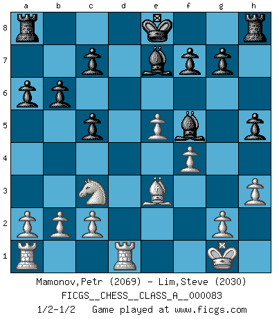 Last move : 1/2-1/2 2011 April 14 8:12:38 [Event "FICGS__CHESS__CLASS_A__000083"] [Site "FICGS"] [Date "2010.12.01"] [Round "1"] [White "Mamonov,Petr"] [Black "Lim,Steve"] [Result "1/2-1/2"] [WhiteElo "2069"] [BlackElo "2030"] 1.e4 e5 2.Nf3 Nc6 3.Bb5 Nf6 4.O-O Nxe4 5.d4 Nd6 6.Bxc6 dxc6 7.dxe5 Nf5 8.Qxd8+ Kxd8 9.Nc3 Ke8 10.Rd1 Be6 11.Ng5 Bc8 12.h3 Be7 13.Nf3 Nh4 14.Nd4 Nf5 15.Nce2 Nxd4 16.Nxd4 h5 17.f4 a6 18.Be3 c5 19.Ne2 b6 20.Nc3 Bf5 1/2-1/2 Ruy Lopez : Berlin defense, Open variation Kingside Castling by player White (move 4) This chess game ended in a draw. Follow this game move after move (download)In a gambit you give up a Pawn for the sake of getting a lost game. (Samuel Standige Boden) Viele Opfer benötigen überhaupt keine konkrete Berechnung. Es genügt sich die entstehende Position kurz vorzustellen, um uns davon zu überzeugen, dass das Opfer korrekt ist. (Mikhail Nekhemyevich Tal) Los finales de Peón son del Ajedrez lo que el cesped es del Golf. (Cecil Purdy) Demandez au pauvre Cg1 ce qu'il en pense. Eduard Gufeld à propos de la variante Saemisch de l'Est-Indienne. Every now and then a man's mind is stretched by a new idea and never shrinks back to its former dimensions. (Oliver Wendell Holmes, Sr.)