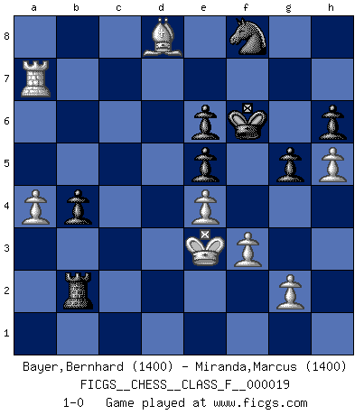 Last move : 1-0 2007 January 1 22:47:12 [Event "FICGS__CHESS__CLASS_F__000019"] [Site "FICGS"] [Date "2006.12.01"] [Round "1"] [White "Bayer,Bernhard"] [Black "Miranda,Marcus"] [Result "1-0"] [WhiteElo "1400"] [BlackElo "1400"] 1.e4 e5 2.Nf3 Nc6 3.Bb5 a6 4.Ba4 Nf6 5.O-O b5 6.Bb3 Be7 7.d4 d6 8.dxe5 dxe5 9.Qxd8+ Bxd8 10.Nc3 O-O 11.Be3 Re8 12.Ng5 Be6 13.Nxe6 fxe6 14.a4 b4 15.Ne2 Na5 16.f3 Nxb3 17.cxb3 a5 18.Nc1 Be7 19.Nd3 Nd7 20.Rac1 Bd6 21.Rfd1 Rec8 22.Kf1 Kf7 23.Kf2 h6 24.h4 Kf6 25.Rc6 Nb8 26.Rc2 Ra6 27.Nc5 Rc6 28.Rdc1 Bxc5 29.Rxc5 Rxc5 30.Rxc5 Nd7 31.Rxa5 c5 32.Ke2 g5 33.Ra7 Nf8 34.h5 c4 35.bxc4 Rxc4 36.Bb6 Rc2+ 37.Ke3 Rxb2 38.Bd8+ 1-0 Ruy Lopez : 5.O-O Kingside Castling by player White (move 5) Kingside Castling by player Black (move 10) Player White won this chess game. Follow this game move after move (download)I had a toothache during the first game. In the second game I had a headache. In the third game it was an attack of rheumatism. In the fourth game, I wasn't feeling well. And in the fifth game? Well, must one have to win every game ? (Siegbert Tarrasch) Deine Wertungszahl - vorausgesetzt einige Jahre schachliche Anstrengung - entspricht etwa dem zehnfachen Deines IQ plus 1000. (Jonathan Levitt) Siempre es mucho mejor sacrificar las piezas de tu oponente. (Savielly Tartakover) Horreur, mais aussi harmonie suprême : qu'y avait-il en effet au monde en dehors des échecs ? Le brouillard, l'inconnu, le non-être... (Vladimir Nabokov) Once you start thinking you have nothing left to learn, you have everything to learn. (Steve Badget)