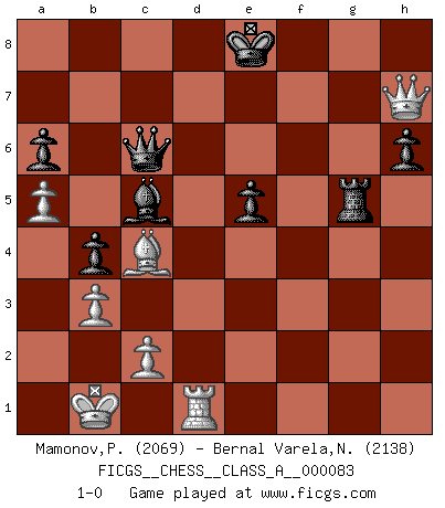 Last move : 1-0 2011 September 7 7:31:36 [Event "FICGS__CHESS__CLASS_A__000083"] [Site "FICGS"] [Date "2010.12.01"] [Round "1"] [White "Mamonov,Petr"] [Black "Bernal Varela,Nelson"] [Result "1-0"] [WhiteElo "2069"] [BlackElo "2138"] 1.e4 c5 2.Nf3 d6 3.d4 cxd4 4.Nxd4 Nf6 5.Nc3 a6 6.Be3 e5 7.Nb3 Be6 8.f3 Nbd7 9.Qd2 b5 10.a4 b4 11.Nd5 Bxd5 12.exd5 Nb6 13.Bxb6 Qxb6 14.O-O-O Be7 15.a5 Qb7 16.Kb1 O-O 17.g4 Rac8 18.f4 Ne4 19.Qe3 Nf6 20.Qe2 Qc7 21.fxe5 dxe5 22.Bh3 Rcd8 23.Bg2 Bd6 24.g5 Nd7 25.Be4 Nc5 26.Nxc5 Bxc5 27.Rd3 f5 28.gxf6 Rxf6 29.Rf1 Rdf8 30.Rxf6 Rxf6 31.d6 Bxd6 32.Rd5 Bf8 33.Bd3 Qc6 34.Qe4 h6 35.h4 Bd6 36.b3 g6 37.h5 Kg7 38.Bc4 gxh5 39.Qe2 Kf8 40.Qxh5 Ke7 41.Qh4 Bb8 42.Rd1 Ba7 43.Qe1 Rf5 44.Rd5 Bc5 45.Qe4 Rg5 46.Qh7+ Ke8 47.Rd1 1-0 Sicilian : Najdorf, Byrne (English) attack Queenside Castling by player White (move 14) Kingside Castling by player Black (move 16) Player White won this chess game. Follow this game move after move (download)In Fischer's hands, a slight theoretical advantage is as good a being a Queen ahead. (Isaac Kashdan) Der Umstand, daß uns eine 7 Stunden Zeitkontrolle ermöglicht eine großartige, tiefe Partie zu spielen, ist für die Massenmedien nicht weiter von Bedeutung. (Alexej Shirov) Hay jugadores fuertes y personas amables y yo soy un jugador fuerte. (Bobby Fischer) Il vaut toujours mieux jouer un plan faux de façon logique que de n'avoir pas de plan du tout. (Victor Kortchnoï) Establishing goals is all right if you don't let them deprive you of interesting detours. (Doug Larson)