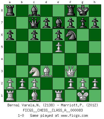 Last move : 1-0 2011 April 20 4:5:25 [Event "FICGS__CHESS__CLASS_A__000083"] [Site "FICGS"] [Date "2010.12.01"] [Round "1"] [White "Bernal Varela,Nelson"] [Black "Marriott,Peter"] [Result "1-0"] [WhiteElo "2138"] [BlackElo "2012"] 1.e4 c5 2.Nf3 e6 3.d4 cxd4 4.Nxd4 a6 5.Bd3 Qc7 6.O-O Nf6 7.Nc3 Be7 8.Qf3 Nc6 9.Nxc6 bxc6 10.Re1 O-O 11.e5 1-0 This chess game has been lost on time (started : 2010.12.01 0:47:21) Sicilian : Kan, 5.Bd3 Kingside Castling by player White (move 6) Kingside Castling by player Black (move 10) Player White won this chess game. Follow this game move after move (download)Chess is in its essence a game, in its form an art, and in its execution a science. (Baron Tassilo) Der Traum, für den ich lebe, ist der von einem freien Russland. Viele mögen sagen: Russland hat doch ein Parlament, einen gewählten Präsidenten. Aber ich spüre, dass in meiner Heimat die Angst wiederkehrt. Eine Angst, sich frei zu äußern, bestimmte Dinge zu tun (Garry Kasparov) El jugador táctico sabe que hacer cuando hay algo que hacer; mientras que el estratega sabe que hacer cuando no hay nada que hacer. (Gerald Abrahams) Les Echecs sont et restent toujours un combat, un combat intégral comme la boxe, la lutte ou un autre sport, et où il doit y avoir un vainqueur et un vaincu. (Joseph Emil Diemer) May I never be complete. May I never be content. May I never be perfect. Deliver me, Tyler, from being perfect and complete. (Chuck Palahniuk, Fight Club)