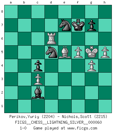 Last move : 1-0 2010 December 2 7:3:19 [Event "FICGS__CHESS__LIGHTNING_SILVER__000060"] [Site "FICGS"] [Date "2010.12.02"] [Round "1"] [White "Perikov,Yuriy"] [Black "Nichols,Scott"] [Result "1-0"] [WhiteElo "2204"] [BlackElo "2215"] 1.e4 e5 2.Nf3 Nc6 3.Bb5 a6 4.Ba4 Nf6 5.O-O Be7 6.Re1 b5 7.Bb3 d6 8.c3 O-O 9.h3 Na5 10.Bc2 c5 11.d4 Re8 12.dxe5 dxe5 13.Nxe5 Bb7 14.Nd2 Qc7 15.Nxf7 Kxf7 16.e5 Qc6 17.Ne4 Nd5 18.Qh5+ Kg8 19.Ng5 Bxg5 20.Bxh7+ Kf8 21.Qxg5 Nc4 22.Bf4 Re6 23.Be4 Qc7 24.b3 Ncb6 25.Bg3 Kg8 26.Rad1 Qe7 27.Qg4 Re8 28.Bg6 c4 29.Rd4 Rxg6 30.Qxg6 Qf7 31.Qg5 Bc8 32.bxc4 bxc4 33.Qc1 Bf5 34.f3 Re6 35.Kh2 Qf8 36.Bh4 Re8 37.Qg5 a5 38.Bf2 Re6 39.f4 Bd3 40.Bh4 a4 41.g4 Re8 42.e6 Qd6 43.Bg3 Rxe6 44.f5 Qe7 45.Qxe7 Rxe7 46.Rxe7 Nxe7 47.Rd6 Nbd5 48.Be5 Bb1 49.Ra6 Bxa2 50.Rxa4 Bb3 51.Ra6 Bc2 52.Kg3 Ne3 53.Kf4 N3d5+ 54.Kg5 Kf7 55.h4 Bb3 56.h5 Bc2 57.Rd6 1-0 Thibault de Vassal Wow, another very nice game! Ruy Lopez : Closed Kingside Castling by player White (move 5) Kingside Castling by player Black (move 8) Player White won this chess game. Follow this game move after move (download)The way he plays Chess demonstrates a man's whole nature. (Stanley Ellin) Ich verachte die Medien. (Robert James Fischer) Existen dos clases de sacrificios: los correctos y los míos. (Mikhail Tal) Vous savez, camarade Pachman, je n'éprouve pas de plaisir à être ministre, je jouerais plutôt aux échecs comme vous, ou alors ferais une révolution au Venezuela. (Che Guevara à Ludek Pachman, 'Checkmate in Prague', 1975) I'm extremely disappointed. I send you out for exciting, new designer drugs, you come back with tomato sauce. (Gregory House, House M.D.)