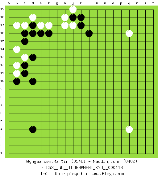 Last move : 1-0 2011 January 27 23:35:0 [Event "FICGS__GO__TOURNAMENT_KYU__000113"] [Site "FICGS"] [Date "2010.12.02"] [Round "1"] [Black "Wyngaarden,Martin"] [White "Maddin,John"] [Result "1-0"] [Rating 1 "0348"] [Rating 2 "0402"] 1.c15 q4 2.d4 q16 3.l16 c17 4.d17 d18 5.c16 e17 6.d16 b17 7.e16 f17 8.f16 h17 9.k17 j17 10.k18 j19 11.j18 h18 12.d10 c13 13.c12 b12 14.c11 b11 15.b10 b14 16.d13 1-0 This go game has been lost on time (started : 2010.12.02 20:11:22) Here are the names of the openings (joseki) played in the four corners : Corner q16 : q16 l16 Hoshi (Hwajeom, Seongjeom, Xingwei`) 4-4 Point. The star or hoshi (4-4) point, emphasizing influence at the potential expense of territory. Corner d16 : c15 c17 Mokuhazushi (Waemok, Wai`mu`) 5-3 Point. The mokuhazushi (5-3) point was popular in the Edo period in Japan (1600 - 1867). It emphasizes influence; territorially, it is inferior to the 3-4 point. San-san. White goes for profit at the expense of influence. A ladder helps White when playing 2. Corner d4 : d4 1-0 Hoshi (Hwajeom, Seongjeom, Xingwei`) 4-4 Point. The star or hoshi (4-4) point, emphasizing influence at the potential expense of territory. Player Black won this Go (weiqi, baduk) game. Follow this game move after move (download)Do not fear furikawari. (Anonymous) Big Chess is a place for big hallucinations. (Thibault de Vassal)