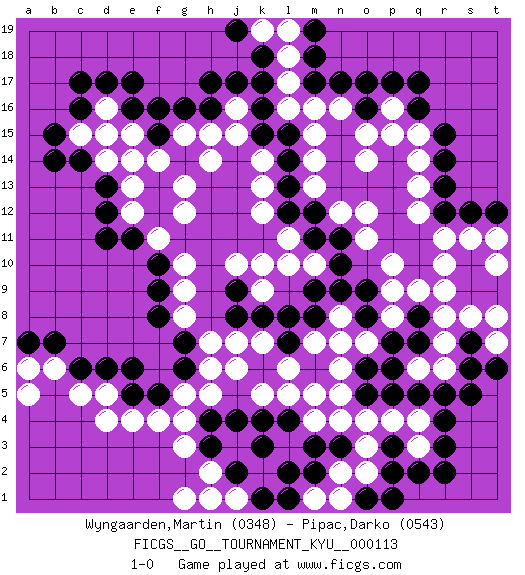 Last move : 1-0 2011 May 23 1:58:18 [Event "FICGS__GO__TOURNAMENT_KYU__000113"] [Site "FICGS"] [Date "2010.12.02"] [Round "1"] [Black "Wyngaarden,Martin"] [White "Pipac,Darko"] [Result "1-0"] [Rating 1 "0348"] [Rating 2 "0543"] 1.q16 d4 2.r5 d16 3.j4 k10 4.e5 d5 5.d6 e4 6.f5 f4 7.k15 g5 8.e6 g3 9.h4 g4 10.c6 c5 11.h3 h2 12.n3 j6 13.d11 r10 14.r12 o14 15.c16 d14 16.d17 e15 17.o16 q4 18.r4 q3 19.q5 p4 20.p5 o4 21.o5 n4 22.m3 m4 23.l4 m5 24.k4 h5 25.j2 g1 26.s10 b6 27.b7 a5 28.e17 q14 29.r14 q13 30.r13 q12 31.h17 r7 32.s7 s8 33.s6 r6 34.r3 s11 35.s9 r9 36.t8 r8 37.t9 r11 38.s12 t11 39.t12 t10 40.s5 t7 41.t6 q15 42.r15 o15 43.m6 l5 44.q2 o3 45.p2 o2 46.r2 n2 47.m2 m1 48.l2 k5 49.k3 p16 50.p17 p15 51.q17 n16 52.o17 n6 53.o6 m7 54.d13 e13 55.d12 e12 56.e11 f11 57.l13 k13 58.l12 l11 59.m12 k14 60.l14 k12 61.c14 c15 62.n17 m16 63.m17 l16 64.l15 n12 65.m11 m10 66.n11 o12 67.n10 o11 68.m9 l10 69.f10 g10 70.f9 g9 71.f8 g8 72.g7 h7 73.g6 h6 74.n9 n8 75.m8 o7 76.l7 l6 77.k8 k7 78.l8 k9 79.j8 j7 80.o8 n7 81.o9 p10 82.f15 e14 83.g14 j15 84.k16 j16 85.j17 l17 86.k17 l18 87.k18 k19 88.j19 l19 89.m18 m14 90.h1 j1 91.l1 n1 92.k1 h1 93.b14 g12 94.a7 a6 95.b15 d15 96.c17 g15 97.g16 h15 98.f16 f14 99.m19 m13 100.e16 g13 101.p1 n5 102.o1 t8 103.p7 p8 104.q8 p9 105.q7 q6 106.p6 q9 107.j9 j10 108.h16 h14 109.p3 m15 110.pass pass 1-0 Here are the names of the openings (joseki) played in the four corners : Corner d4 : d4 j4 Hoshi (Hwajeom, Seongjeom, Xingwei`) 4-4 Point. The star or hoshi (4-4) point, emphasizing influence at the potential expense of territory. Corner d16 : d16 d11 Hoshi (Hwajeom, Seongjeom, Xingwei`) 4-4 Point. The star or hoshi (4-4) point, emphasizing influence at the potential expense of territory. Player Black won this Go (weiqi, baduk) game. Follow this game move after move (download)The enemy's vital point is your own. (Anonymous) Only sick music makes money today. (Friedrich Nietzsche)