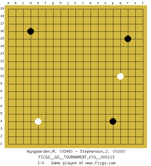 Last move : 1-0 2011 January 8 10:41:45 [Event "FICGS__GO__TOURNAMENT_KYU__000113"] [Site "FICGS"] [Date "2010.12.02"] [Round "1"] [Black "Wyngaarden,Martin"] [White "Stephenson,Josh"] [Result "1-0"] [Rating 1 "0348"] [Rating 2 "0100"] 1.r15 e4 2.d16 q10 3.p4 1-0 This go game has been lost on time (started : 2010.12.02 20:11:22) Here are the names of the openings (joseki) played in the four corners : Corner q4 : p4 1-0 Takamoku (Gomok, Gaomu`) 5-4 Point. The takamoku (high) point (5-4). With its emphasis on influence, the 5-4 point complements the 4-4 (hoshi) point in creating an influence-oriented fuseki. Player Black won this Go (weiqi, baduk) game. Follow this game move after move (download)Learn to play under the stones. (Anonymous) Wawaweewa ! (Borat: Cultural learnings of America for make benefit glorious nation of Kazakhstan)