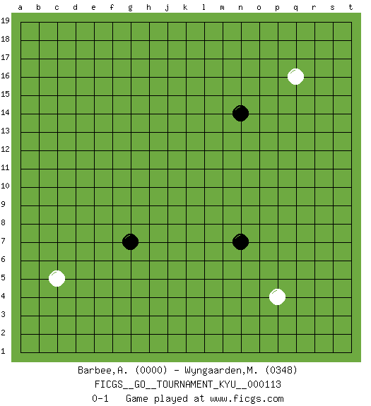 Last move : 0-1 2011 January 8 22:44:47 [Event "FICGS__GO__TOURNAMENT_KYU__000113"] [Site "FICGS"] [Date "2010.12.02"] [Round "1"] [Black "Barbee,Alexander"] [White "Wyngaarden,Martin"] [Result "0-1"] [Rating 1 "0000"] [Rating 2 "0348"] 1.g7 c5 2.n14 q16 3.n7 p4 0-1 This go game has been lost on time (started : 2010.12.02 20:11:22) Here are the names of the openings (joseki) played in the four corners : Corner d4 : g7 c5 This joseki is unknown. A weak or weird move has probably been played in this corner. Corner q16 : n14 q16 This joseki is unknown. A weak or weird move has probably been played in this corner. Corner q4 : n7 p4 This joseki is unknown. A weak or weird move has probably been played in this corner. Player White won this Go (weiqi, baduk) game. Follow this game move after move (download)Win the stones, lose the game. (Anonymous) The bottom line is always the bottom line. (Johann Piek)