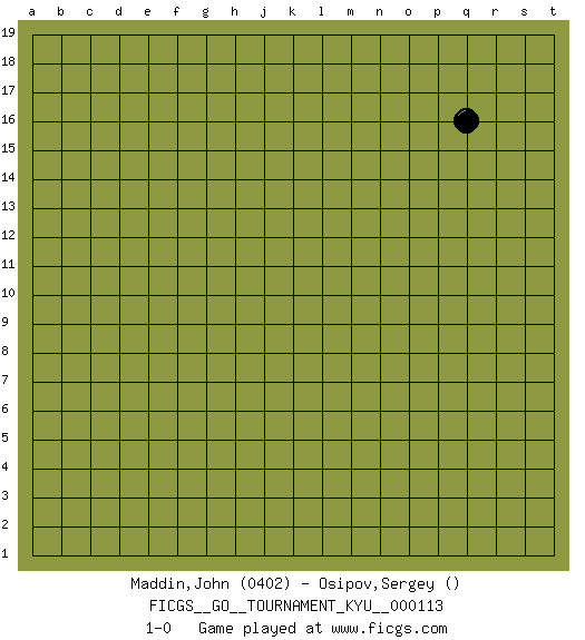 Last move : 1-0 2010 December 6 16:43:47 [Event "FICGS__GO__TOURNAMENT_KYU__000113"] [Site "FICGS"] [Date "2010.12.02"] [Round "1"] [Black "Maddin,John"] [White "Osipov,Sergey"] [Result "1-0"] [Rating 1 "0402"] 1.q16 1-0 Here are the names of the openings (joseki) played in the four corners : Player Black won this Go (weiqi, baduk) game. Follow this game move after move (download)Answer the keima with a kosumi. (Anonymous) 98% of all statistics are made up. (Author unknown)
