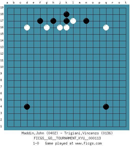 Last move : 1-0 2011 January 31 23:42:26 [Event "FICGS__GO__TOURNAMENT_KYU__000113"] [Site "FICGS"] [Date "2010.12.02"] [Round "1"] [Black "Maddin,John"] [White "Trigiani,Vincenzo"] [Result "1-0"] [Rating 1 "0402"] [Rating 2 "0136"] 1.d4 q16 2.q4 d16 3.n17 k16 4.h17 g16 5.f17 j16 6.k17 l17 7.k18 1-0 This go game has been lost on time (started : 2010.12.02 20:11:22) Here are the names of the openings (joseki) played in the four corners : Corner q16 : q16 n17 Hoshi (Hwajeom, Seongjeom, Xingwei`) 4-4 Point. The star or hoshi (4-4) point, emphasizing influence at the potential expense of territory. Niken Kakari (Dukan Keolch'im, E`r Gua`jiao~, 2-Space Low Approach). White typically answers by 7-3 or 3-5 (which is not joseki). Corner d16 : d16 h17 Hoshi (Hwajeom, Seongjeom, Xingwei`) 4-4 Point. The star or hoshi (4-4) point, emphasizing influence at the potential expense of territory. Player Black won this Go (weiqi, baduk) game. Follow this game move after move (download)In an unreasonable situation, an unreasonable move is reasonable. (Tamino) Good decisions come from experience, and experience comes from bad decisions. (Anonymous)
