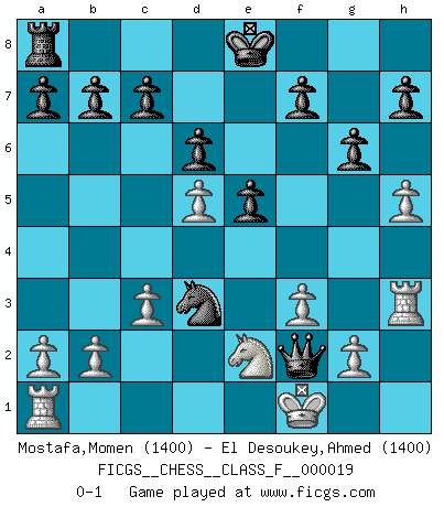 Last move : 0-1 2007 January 31 8:2:27 [Event "FICGS__CHESS__CLASS_F__000019"] [Site "FICGS"] [Date "2006.12.01"] [Round "1"] [White "Mostafa,Momen"] [Black "El Desoukey,Ahmed"] [Result "0-1"] [WhiteElo "1400"] [BlackElo "1400"] 1.e4 g6 2.d3 Bg7 3.Qf3 d6 4.d4 Bxd4 5.Bc4 Nf6 6.c3 Bg4 7.Qf4 Be5 8.Qh6 Nbd7 9.Qg7 Nd5 10.Qxh8+ Bxh8 11.Bxd5 e5 12.f3 Be6 13.h4 Bxd5 14.exd5 Nc5 15.Bg5 Bf6 16.Bxf6 Qxf6 17.h5 Nd3+ 18.Kf1 Qg5 19.Nd2 Qxd2 20.Ne2 Qe3 21.Rh3 Qf2+ 0-1 Robatsch (Modern) defense Player Black won this chess game. Follow this game move after move (download)A bad day of Chess is better than any good day at work. (Anonymous) Im Internet Chess Club betrug mein Rating vorübergehend 3350 ELO-Punkte. (Sergej Karjakin) Si un gobernante no entiende al Ajedrez, ¿como puede governar él un reinado?. (El Rey Khusros II) Tous ces prétendus hommes politiques sont les pions, les Cavaliers, les Tours ou les Fous d'une partie d'échecs qui se jouera tant qu'un hasard ne renversera pas l'échiquier. (Honoré de Balzac) Never risk one's whole fortune unless supported by one's entire army. (Niccolo Machiavelli)