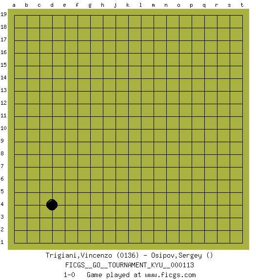 Last move : 1-0 2010 December 6 16:44:10 [Event "FICGS__GO__TOURNAMENT_KYU__000113"] [Site "FICGS"] [Date "2010.12.02"] [Round "1"] [Black "Trigiani,Vincenzo"] [White "Osipov,Sergey"] [Result "1-0"] [Rating 1 "0136"] 1.d4 1-0 Here are the names of the openings (joseki) played in the four corners : Corner d4 : d4 1-0 Hoshi (Hwajeom, Seongjeom, Xingwei`) 4-4 Point. The star or hoshi (4-4) point, emphasizing influence at the potential expense of territory. Player Black won this Go (weiqi, baduk) game. Follow this game move after move (download)Balance is not what players strike for, and if it does arise, it is in spite of them. (Pierre Audouard) Unless I accept my faults I will most certainly doubt my virtues. (Hugh Prather)