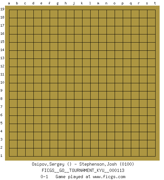 Last move : 0-1 2010 December 6 16:44:19 [Event "FICGS__GO__TOURNAMENT_KYU__000113"] [Site "FICGS"] [Date "2010.12.02"] [Round "1"] [Black "Osipov,Sergey"] [White "Stephenson,Josh"] [Result "0-1"] [Rating 2 "0100"] 0-1 Here are the names of the openings (joseki) played in the four corners : Player White won this Go (weiqi, baduk) game. Follow this game move after move (download)The poor player plays the opponent's game for him. (Anonymous) The general who wins the battle makes many calculations in his temple before the battle is fought. The general who loses makes but few calculations beforehand. (Sun Tzu)